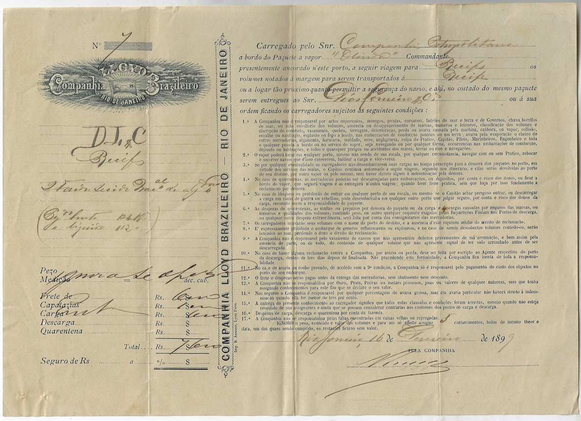 | 73499 | Brasil, 1899, conhecimento de embarque de carga de tecidos de algodão enviada pelo navio a vapor Olinda, do Lloyd Brazileiro, do Rio de Janeiro (16/2) para Recife | 20,00 | Foto |