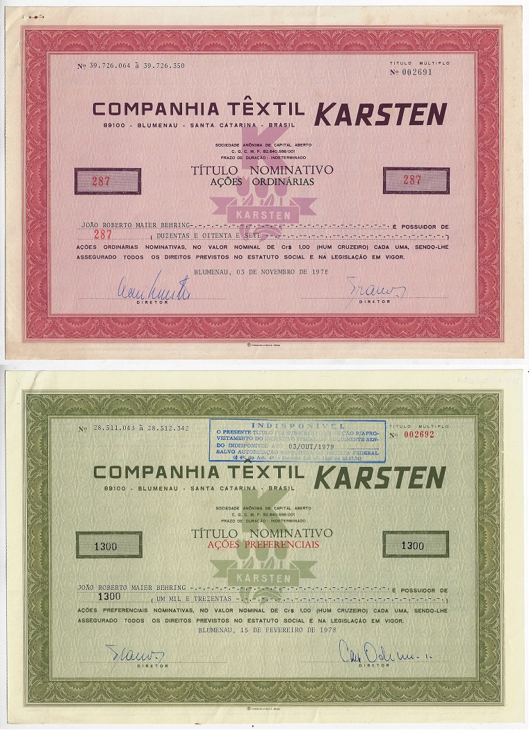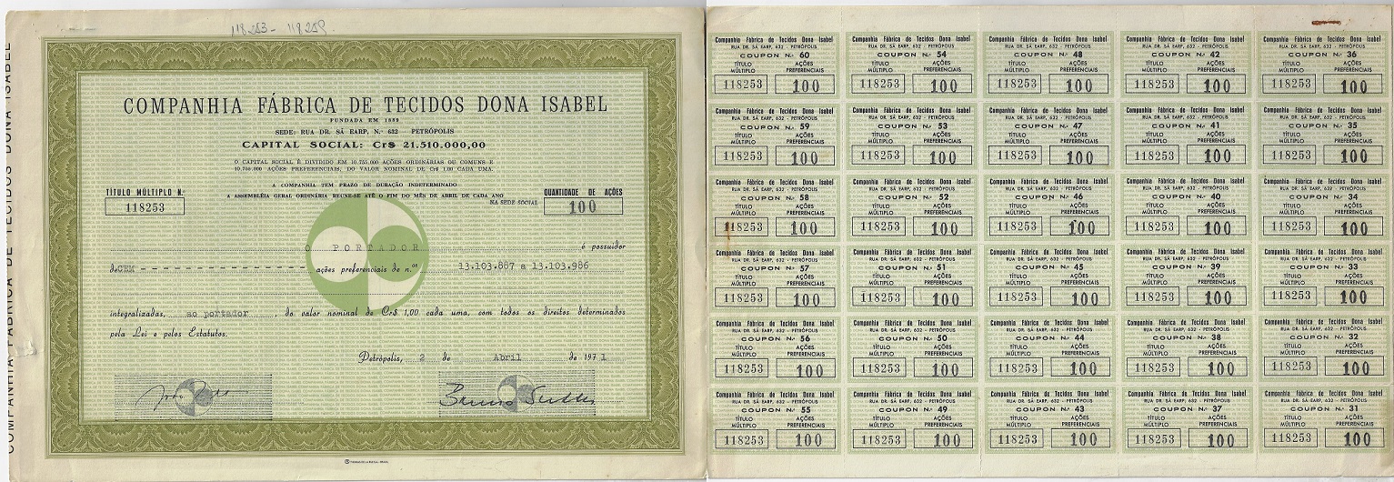 | 81520 | Brasil, 1971, Título de 100 Ações Preferenciais da Companhia Fábrida de Tecidos Dona Isabel, de Petrópolis, com 30 coupons, tamanho 21,5x63 cm | 43,00 | Foto |