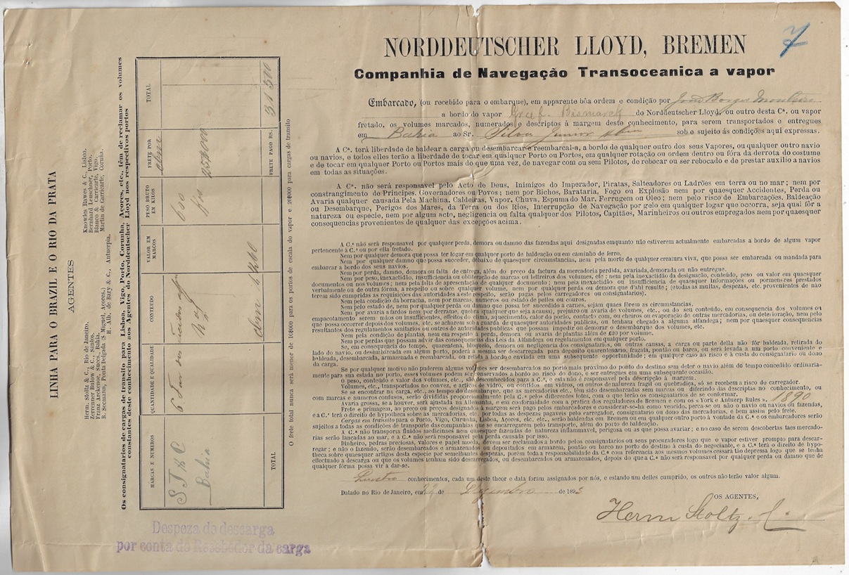 | 73973 | Brasil, 1895, conhecimento de embarque de carga de tecidos de algodão enviada pelo navio a vapor Graf Bismarck, do Norddeutscher Lloyd, do Rio de Janeiro (22/12) para Bahia | 20,00 | Foto |
