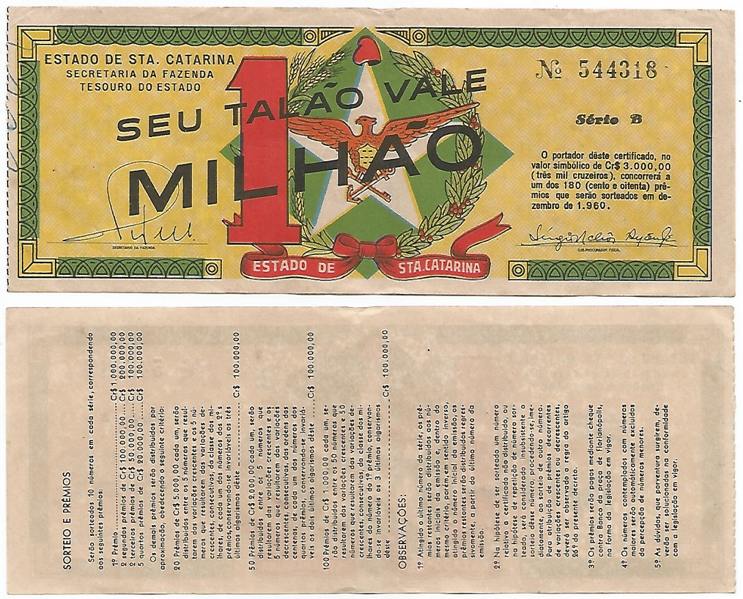 | 74032 | Brasil, 1959, talão da campanha de troca de notas fiscais "Seu talão vale 1 milhão", série B, do Estado de Santa Catarina, tamanho 16,5 x 6,5 cm | 10,00 | Foto |
