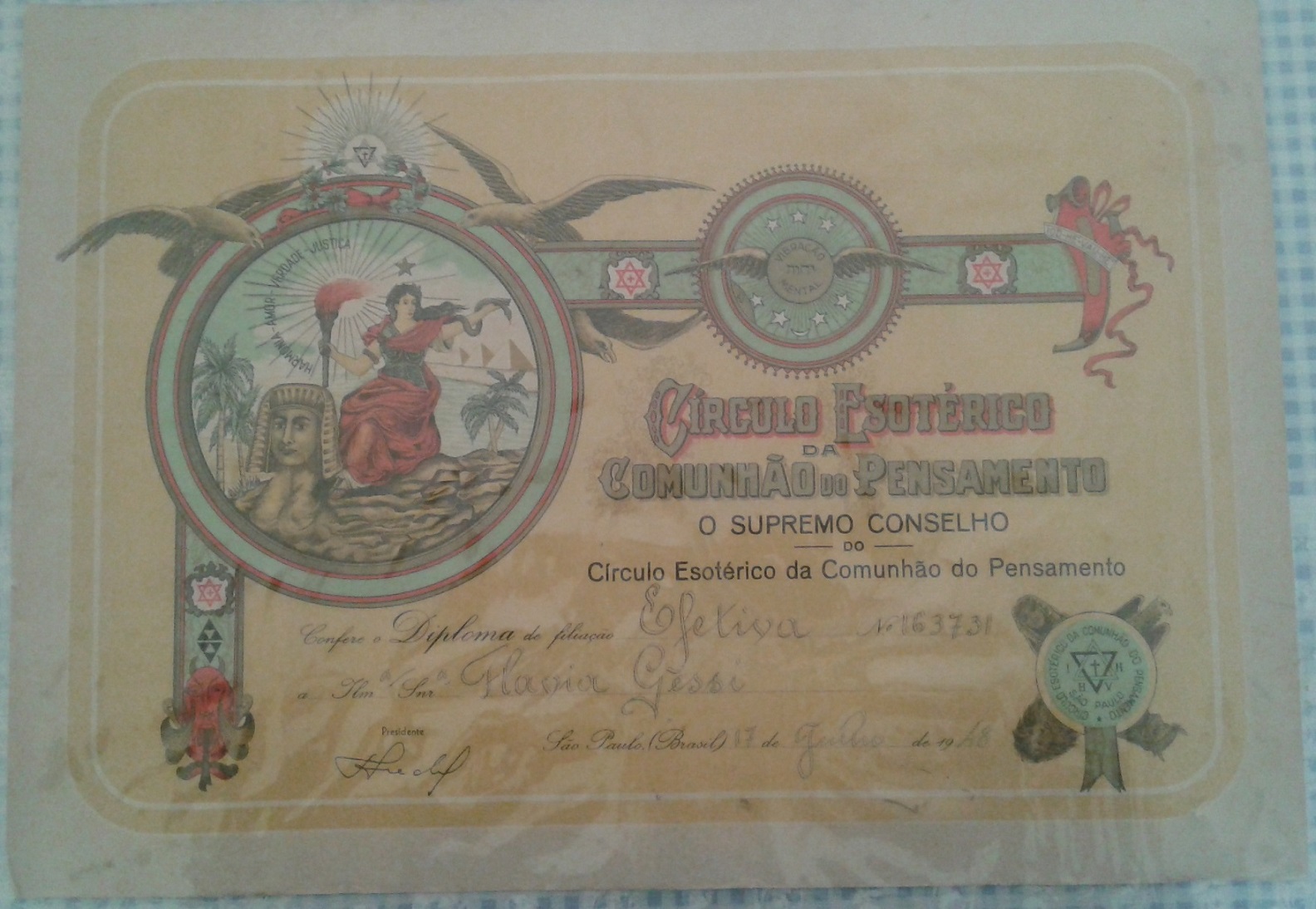 | 74048 | Brasil, 1948, diploma de filiação efetiva do Círculo Esotérico da Comunhão do Pensamento, de São Paulo, tamanho 31x45 cm | 20,00 | Foto |