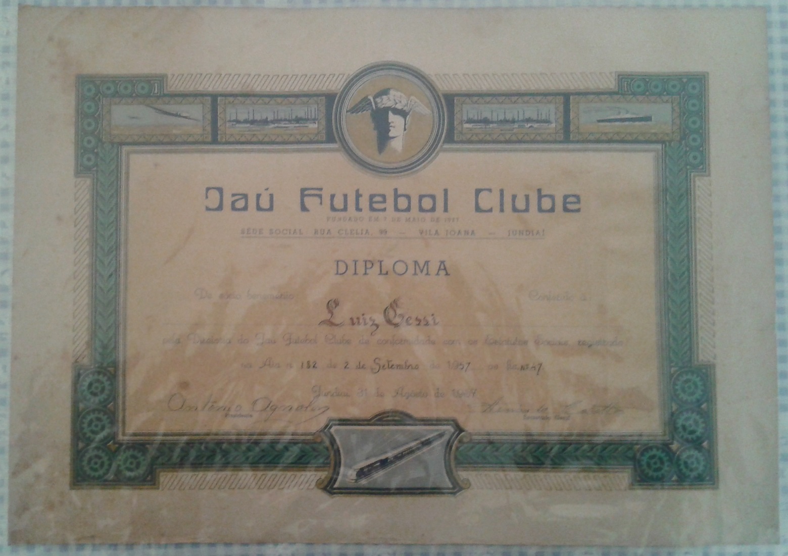 | 74049 | Brasil, 1957, diploma de sócio benemérito do Jaú Futebol Clube, de Jundiaí, tamanho 31x45 cm | 20,00 | Foto |