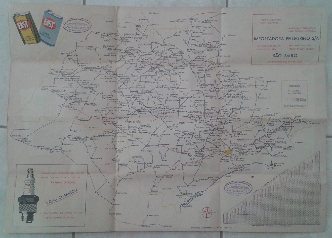 | 74050 | Brasil, 1950s, mapa rodoviário do estado de São Paulo, cortesia da Importadora Pellegrino, com propagandas do Fluido para Freio Hidráulico Fast, Velas Champion e Tornos Imor, tamanho 46x64 cm | 20,00 | Foto |