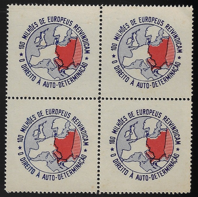 | 75080 | Brasil, 1950s, quadra de etiquetas (cinderelas) com mapa da Europa, destaque para os Países Socialistas, e legenda "100 milhões de Europeus reivindicam o direito à autodeterminação", sem uso | 10,00 | Foto |
