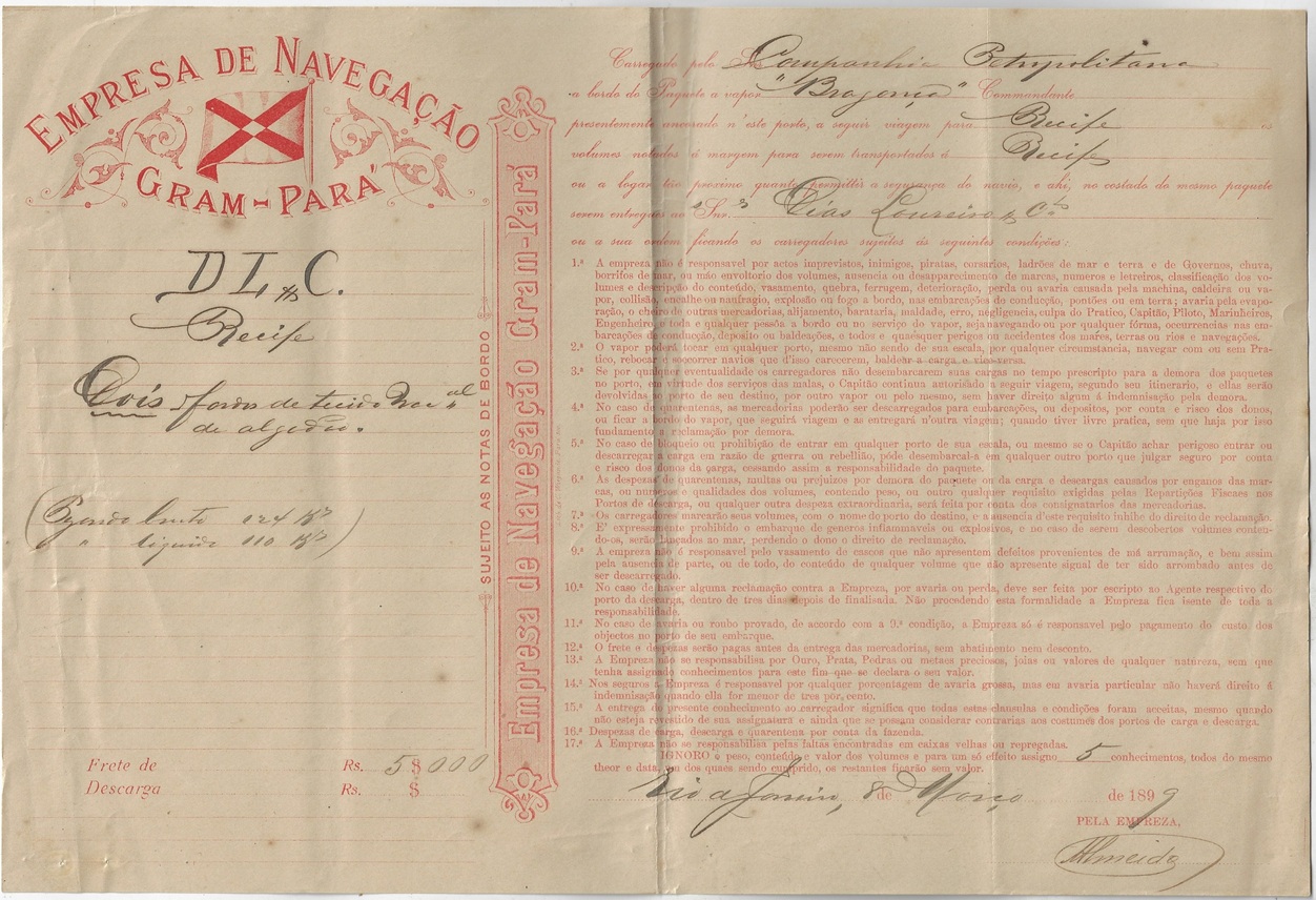 | 75420 | Brasil, 1899, conhecimento de embarque de carga de tecidos de algodão enviada pelo navio a vapor Bragança, do Empresa de Navegação Gram-Pará, do Rio de Janeiro (8/3) para Recife | 20,00 | Foto |