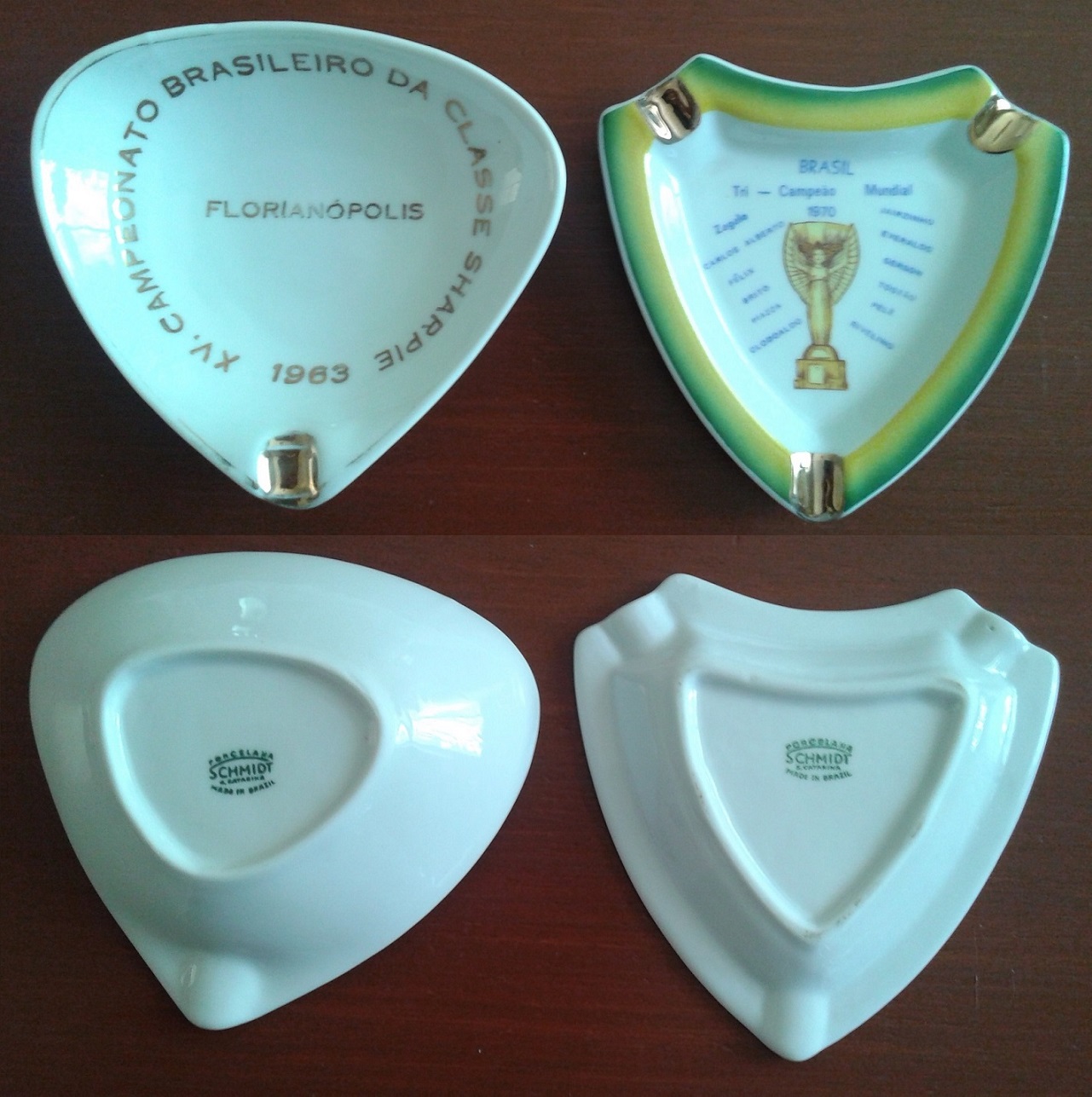 | 75666 | Brasil, 1963 e 1970, 2 cinzeiros das Porcelanas Schmidt, de Santa Catarina, alusivos ao XV Campeonato Brasileiro da Classe Sharpie e ao Tricampeonato Mundial de Futebol | 60,00 | Foto |