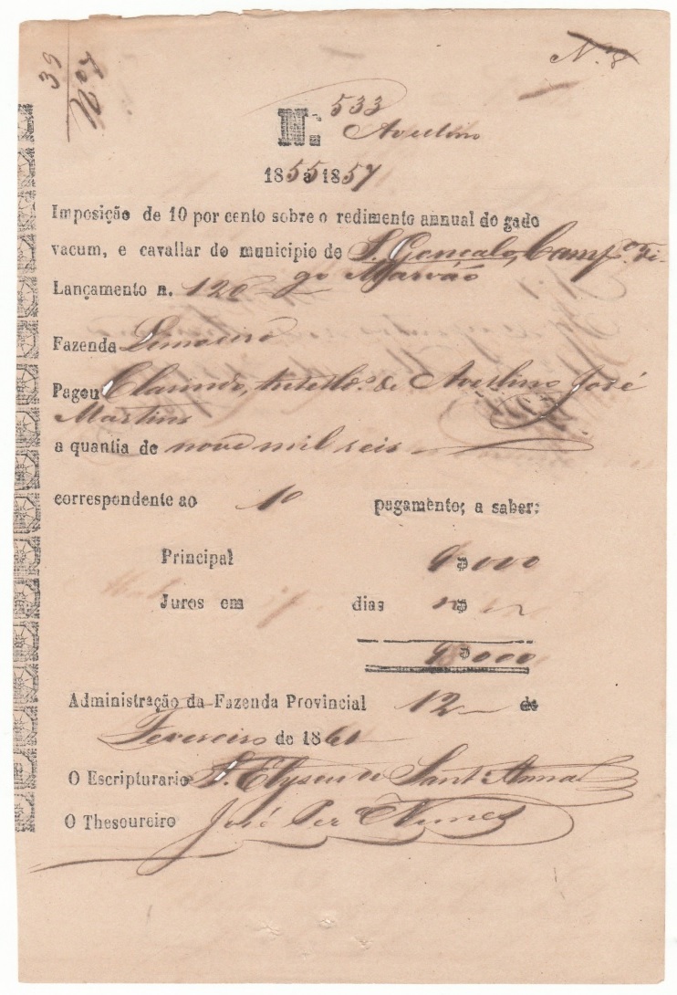 | 77626 | Brasil, 1860, recibo de pagamento de imposto de 10% sobre o rendimento anual do gado vacum e cavalar no período de 1855/1877, no município de São Gonçalo dos Campos | 30,00 | Foto |