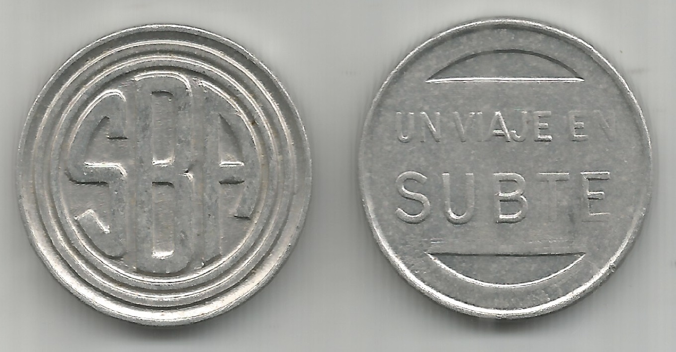 | 78263 | Argentina, 1963/1993, Ficha metálica de Subterráneos de Buenos Aires (SBA), Ø 25 mm | 10,00 | Foto |