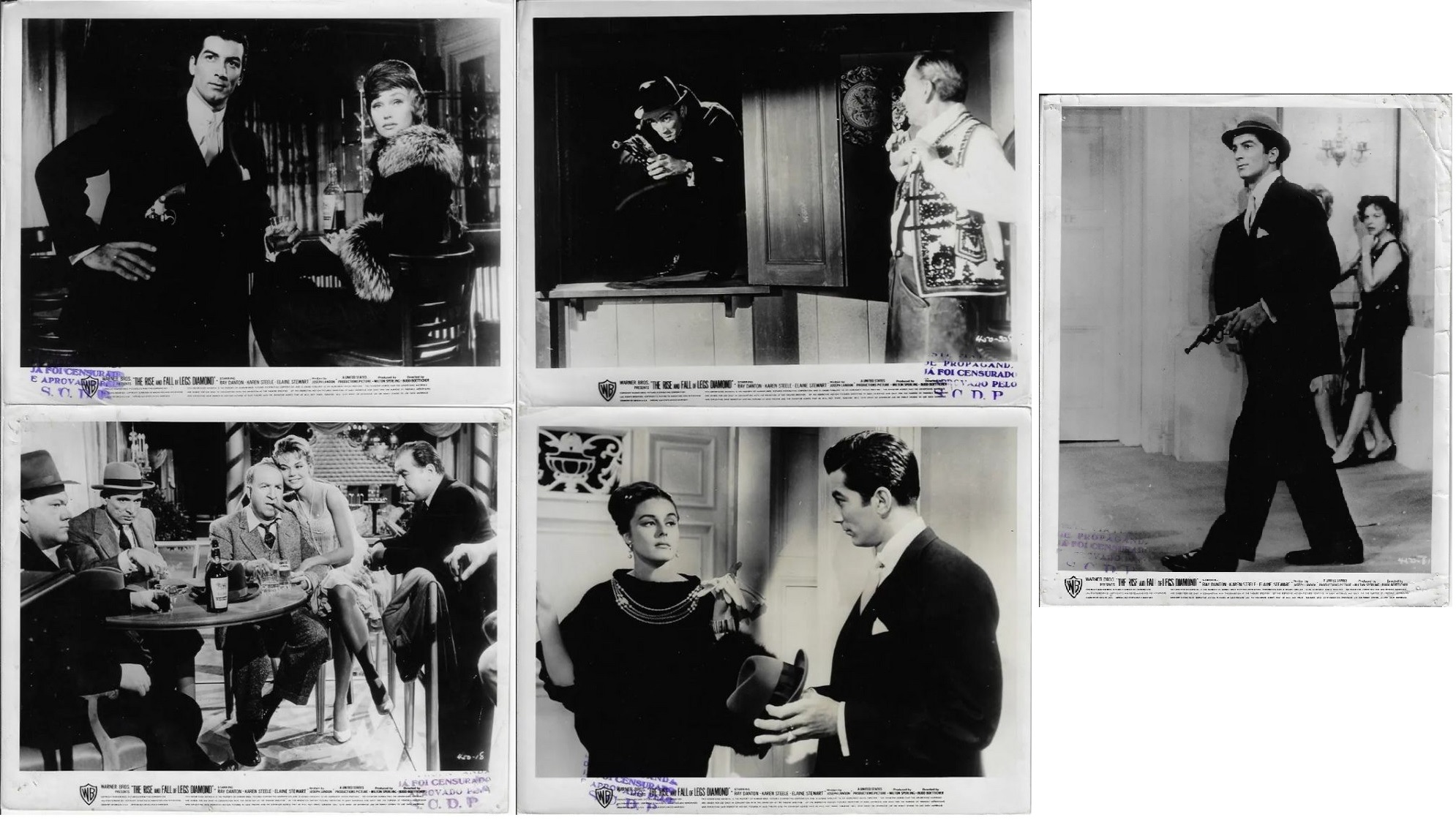 | 78830 | EUA, 1960, 5 Pôsteres tipo Lobby card do filme The Rise and Fall of Legs Diamond (O Rei Dos Facínoras), tamanho 21x26 cm, mínimos furos de tachinha nos cantos, ator Ray Danton e atriz Karen Steele | 40,00 | Foto |