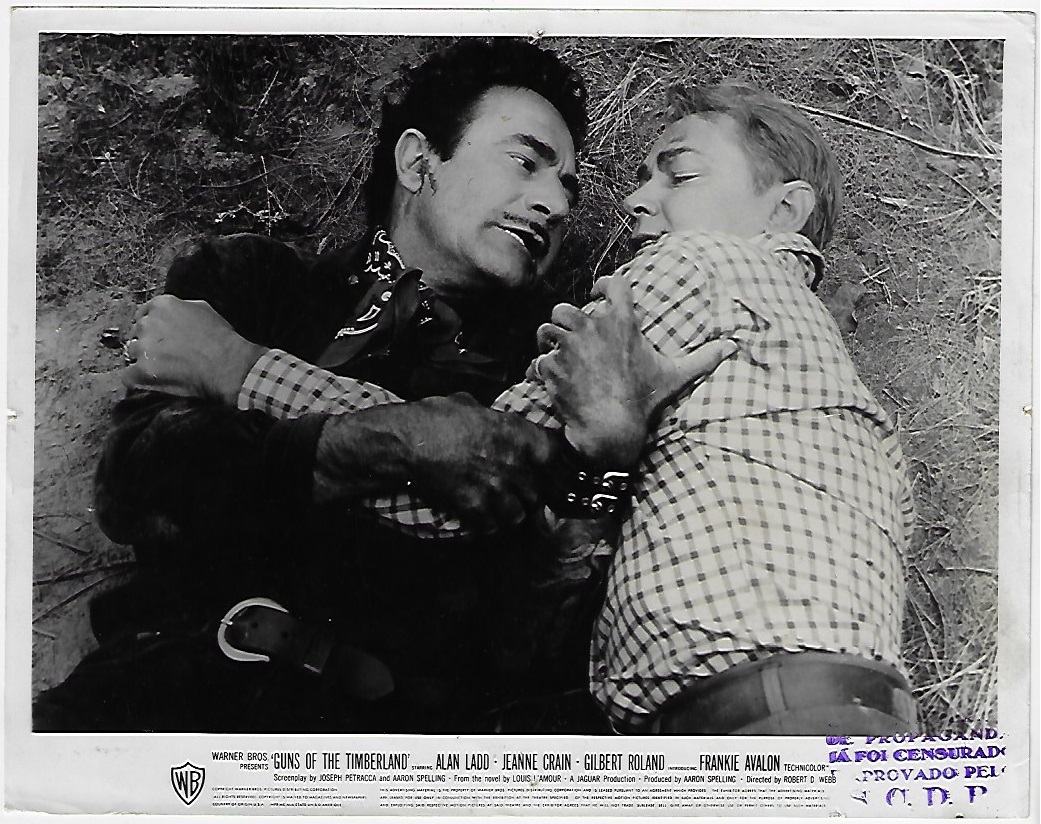 | 78886 | EUA, 1960, Pôster tipo Lobby card do filme "Guns of the Timberland (Gigantes em Luta)", tamanho 20x26 cm, estrelando Alan Ladd e Gilber Roland, mínimos furos de tachinha | 10,00 | Foto |