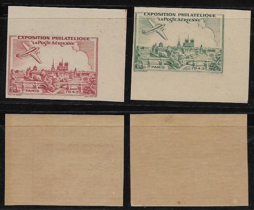 | 79038 | França, 1943, 2 etiquetas alusivas a Exposição Filatélica do Correio Aéreo, retratando Paris, sem uso | 20,00 | Foto |