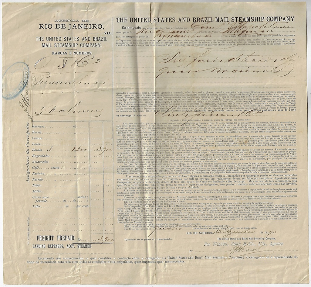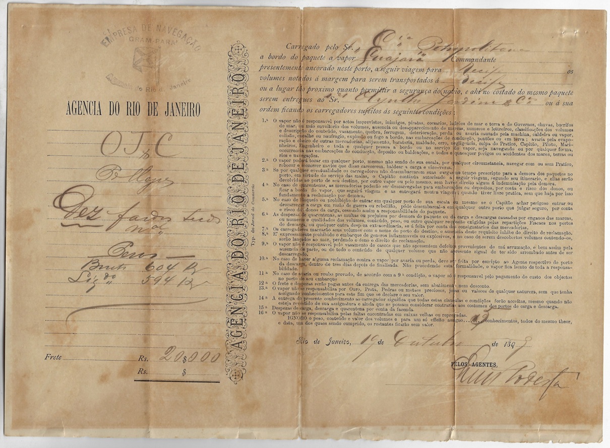 | 80730 | Brasil, 1890, conhecimento de embarque de carga de tecidos de algodão enviada pelo navio a vapor Alliance, do The United States and Brazil Mail Steamship Company, do Rio de Janeiro (12/12) para Pernambuco | 20,00 | Foto |
