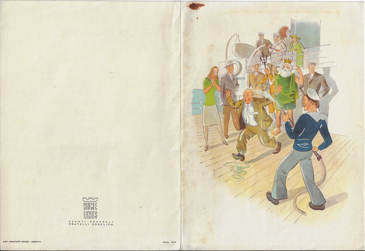 | 79343 | Itália, 1949, programa de bordo para a 1ª Classe do transatlântico S.S. Brasil, da Home Lines, em sua viagem nº 8, tamanho aberto 23x34 cm | 20,00 | Foto |