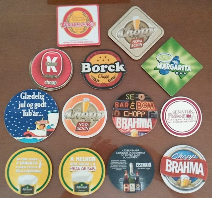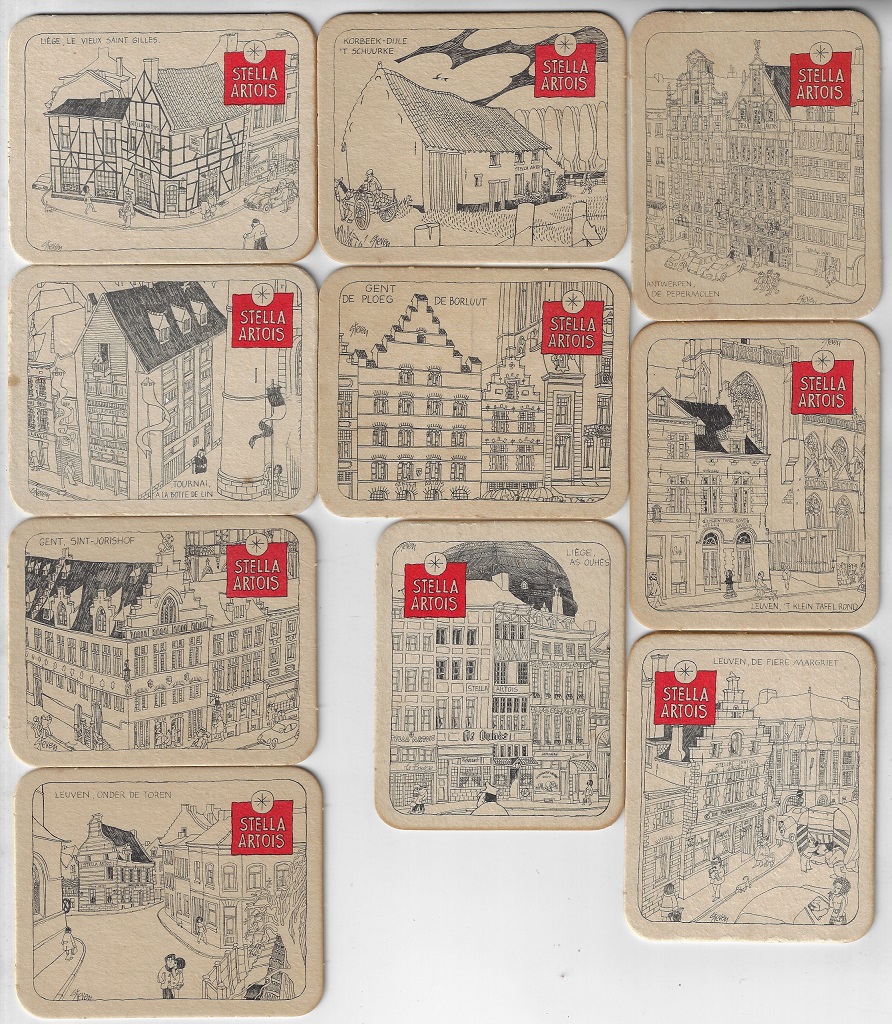 | 84480 | Bélgica, 1980s, conjunto com 10 descansos para copos Cidades como Anvers, Gent, Leuven, Liége, Tournai e Korbeek-Dijle, marca Cerveja Stella Artois | 20,00 | Foto |