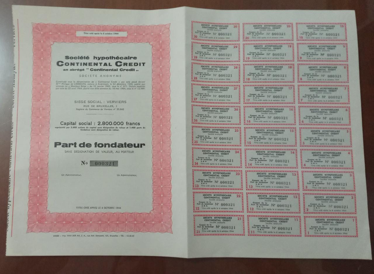 | 80109 | Bélgica, 1944, Ação da Sociéte Hypothécaire Continental Crédit, ao portador, com todos os 30 coupons | 32,00 | Foto |