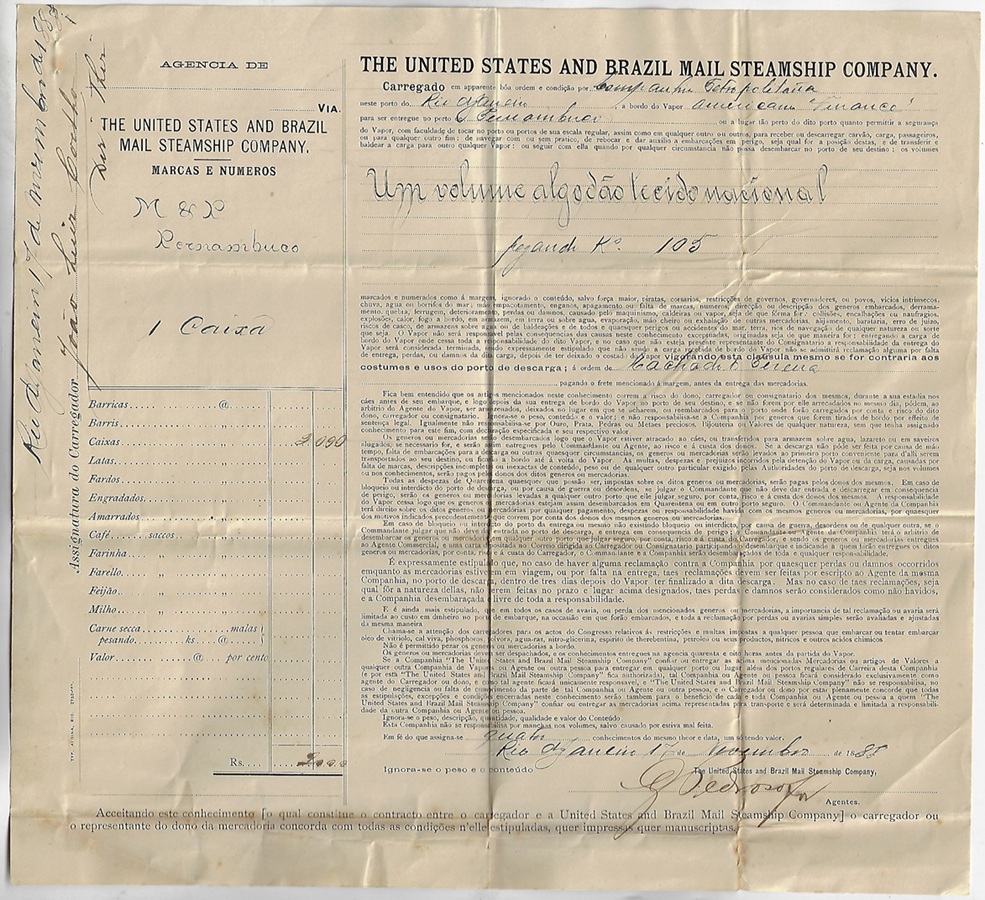 | 80199 | Brasil, 1888, conhecimento de embarque de carga de tecidos de algodão enviada pelo navio a vapor Finance, do The United States and Brazil Mail Steamship Company, do Rio de Janeiro (17/12) para Pernambuco | 20,00 | Foto |