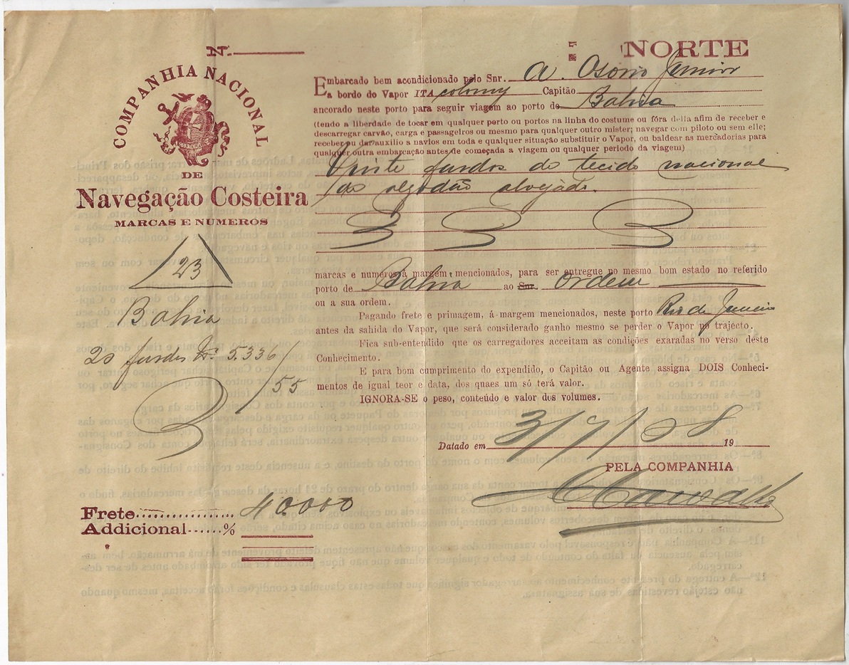 | 80734 | Brasil, 1908, conhecimento de embarque de carga de tecidos de algodão enviada pelo navio a vapor Itacolomy, da Companhaia Nacional de Navegação Costeira, do Rio de Janeiro (3/7) para Bahia | 20,00 | Foto |
