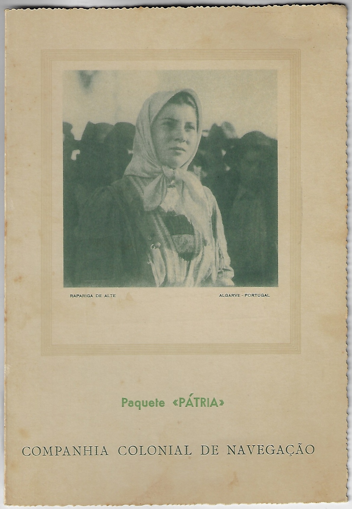 | 80985 | Portugal, 1956, Menu do Paquete Pátria, da Companhia Colonial de Navegação, foto de Rapariga de Alte, em Algarve, tamanho 16x23 cm | 20,00 | Foto |