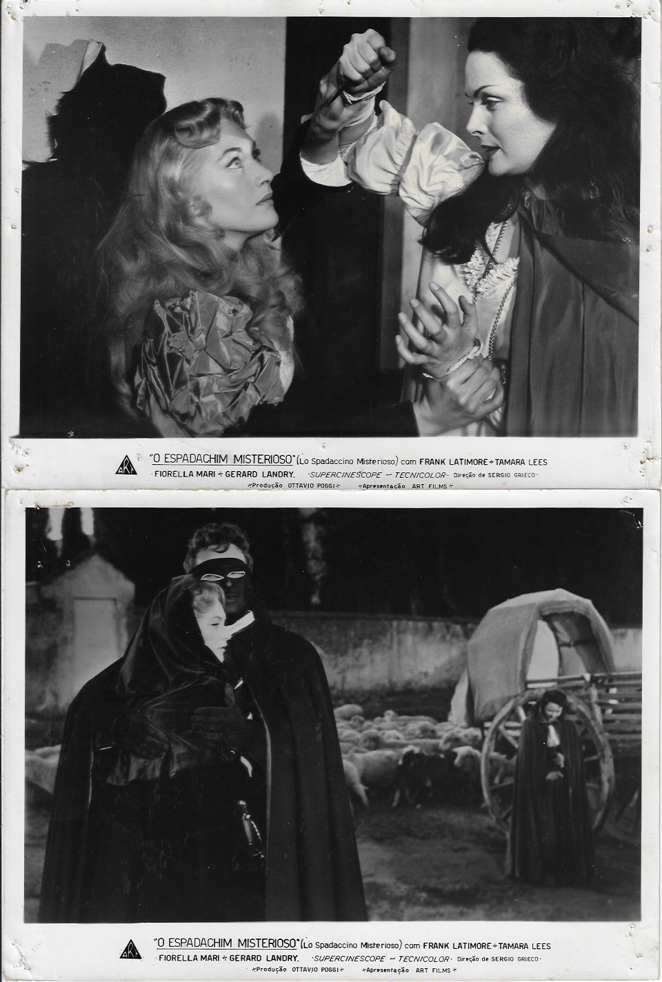 | 81128 | Itália, 1956, 2 Pôsteres tipo Lobby card do filme "Lo Spadaccino Misterioso (O Espadachim Misterioso)", tamanho 20x25 cm, mínimos furos de tachinha nos cantos, Tamara Lees, Fiorella Mari | 16,00 | Foto |