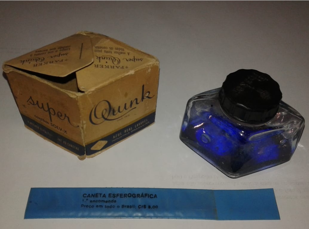 | 81228 | Brasil, 19??, vidro vazio de tinta Parker, na caixa, acompanha plástico de amostra para canetas esferográficas | 100,00 | Foto |