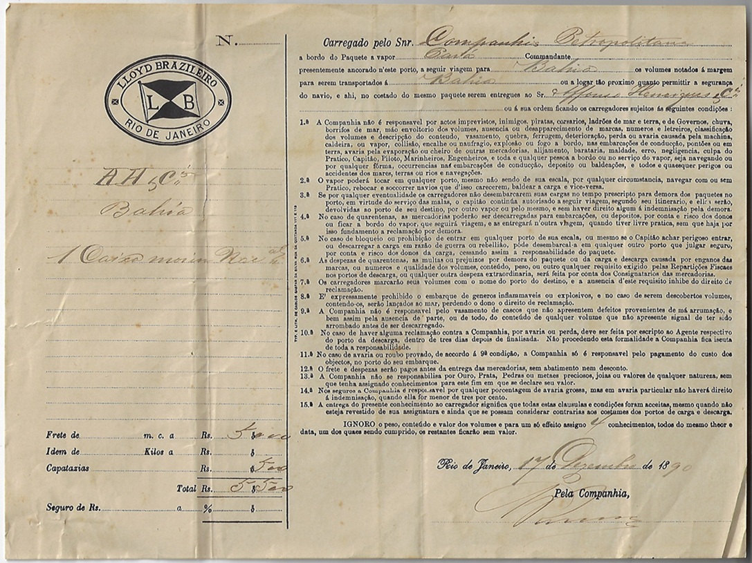 | 82181 | Brasil, 1890, conhecimento de embarque de carga de tecidos de algodão enviada pelo navio a vapor Pará, do Lloyd Brazileiro, do Rio de Janeiro (17/12) para Bahia | 20,00 | Foto |