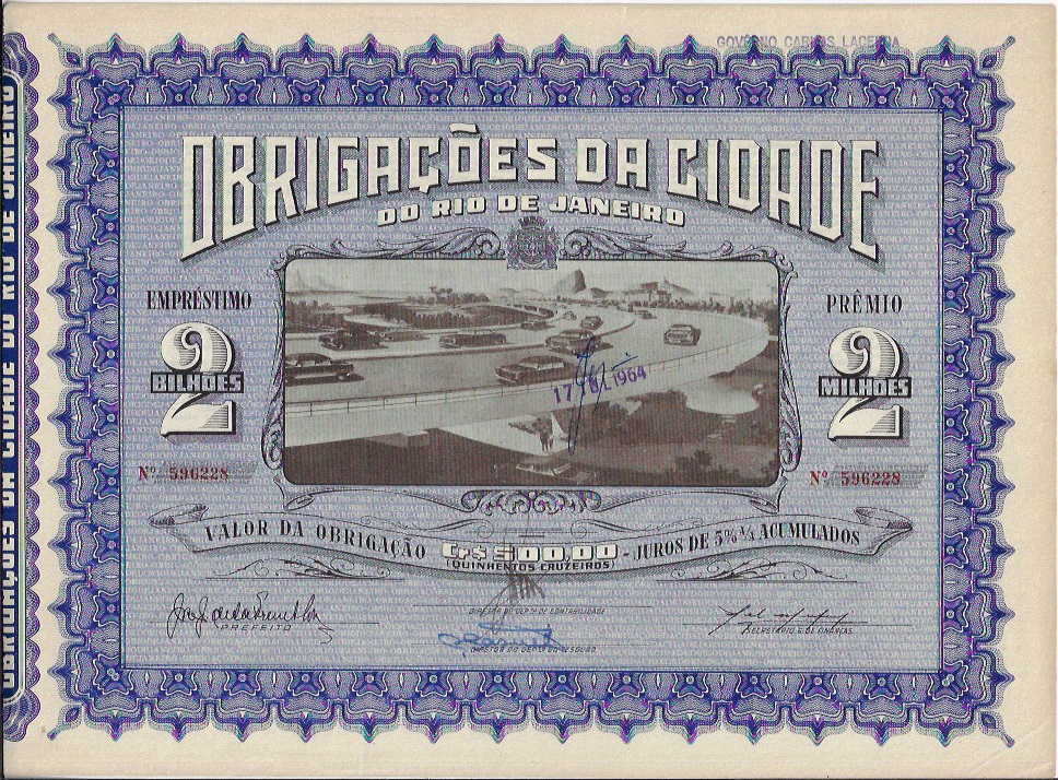 | 83200 | Brasil, 1964, apólice de Obrigações da Cidade do Rio de Janeiro, no valor de Cr$500, tamanho 24x33 cm, soberba | 26,00 | Foto |