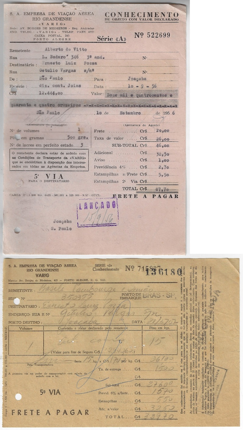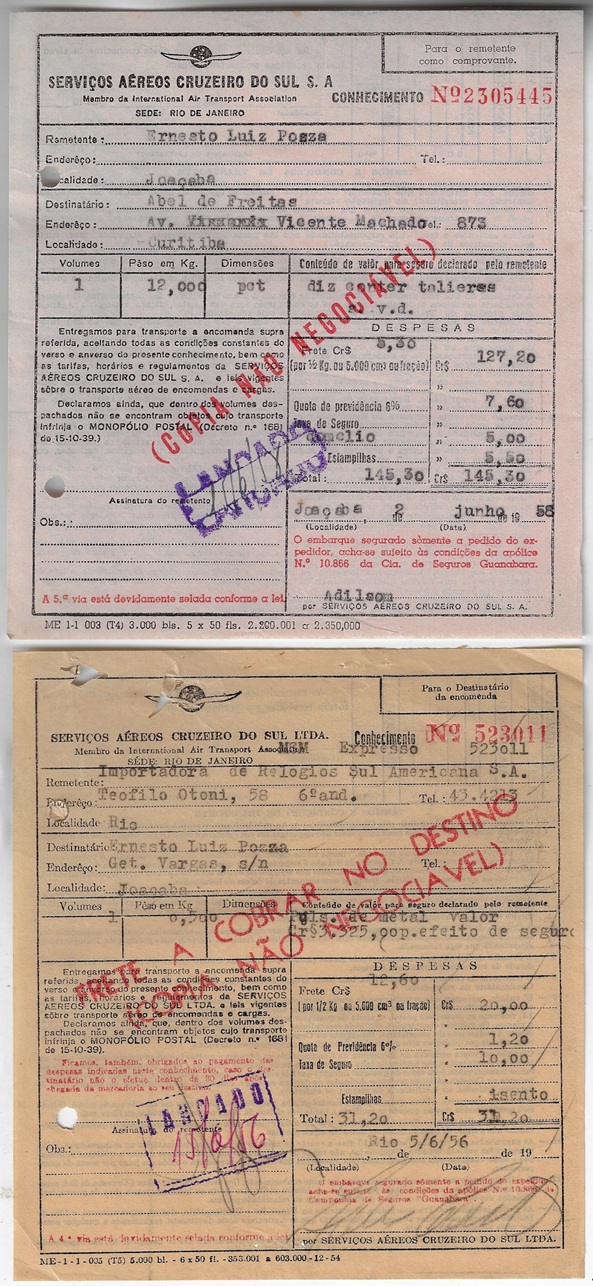 | 83333 | Brasil, 1956/1958, 2 conhecimentos da Serviços Aéreos Cruzeiro do Sul | 20,00 | Foto |