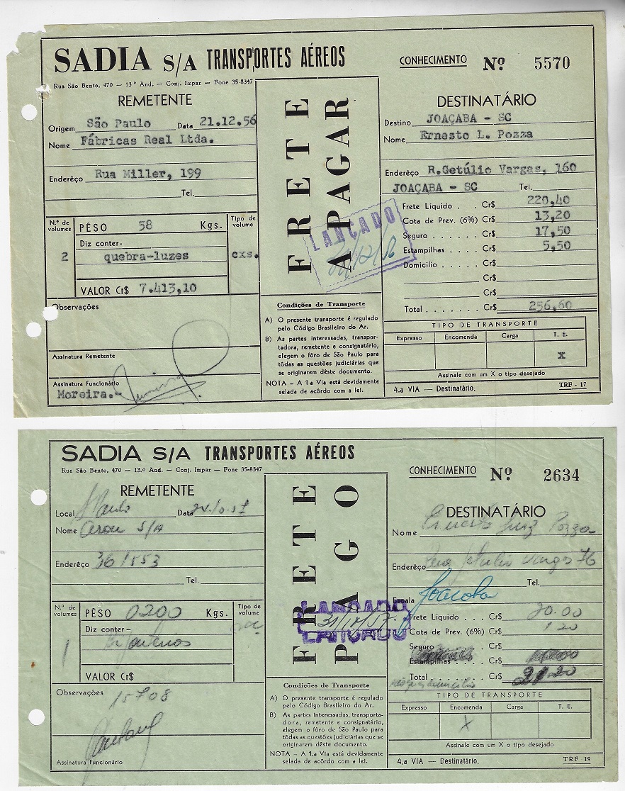 | 83334 | Brasil, 1956/1957, 2 conhecimentos da Sadia Transportes Aéreos | 20,00 | Foto |