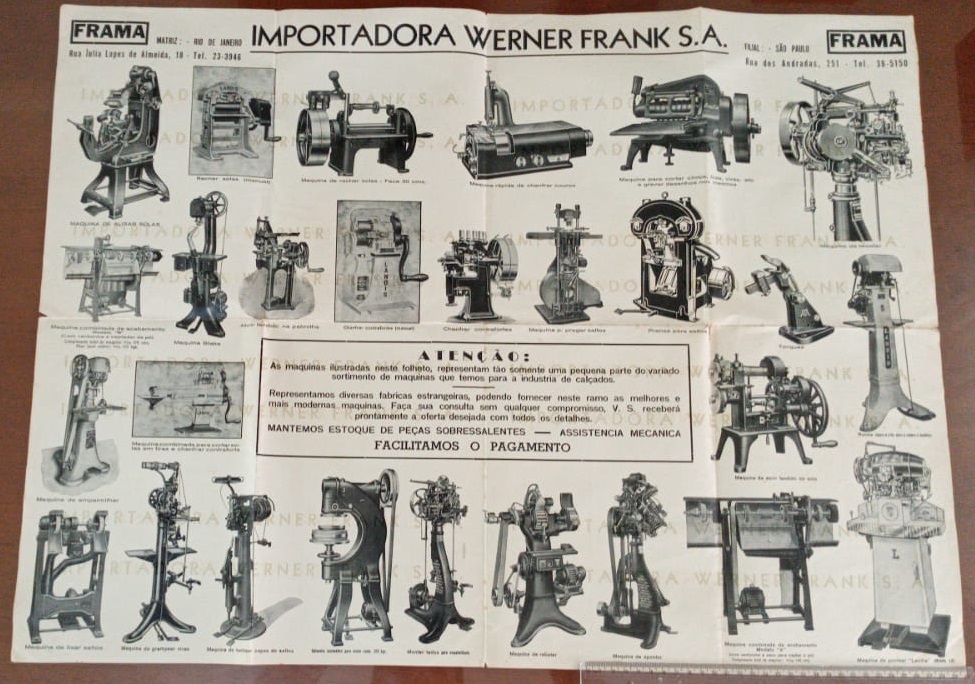 | 83346 | Brasil, 1950s, cartaz pôster tamanho 56x76 cm com propaganda das máquinas para indústria de sapatos representados pela Importadora Werner Frank SA | 50,00 | Foto |