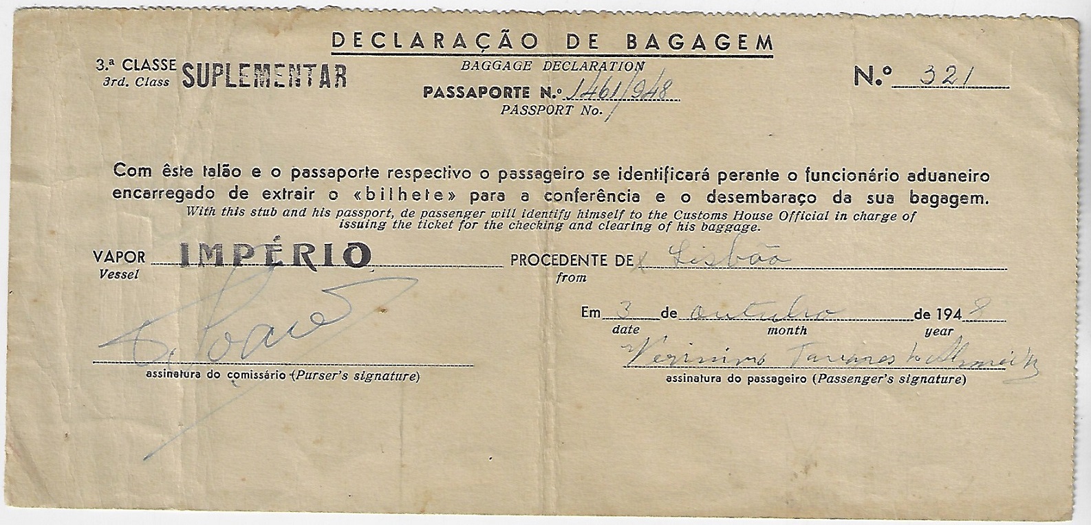 | 83348 | Brasil, 1948, Declaração de Bagagem do Vapor Império, 3ª Classe, procedente de Lisboa / Portugal | 20,00 | Foto |