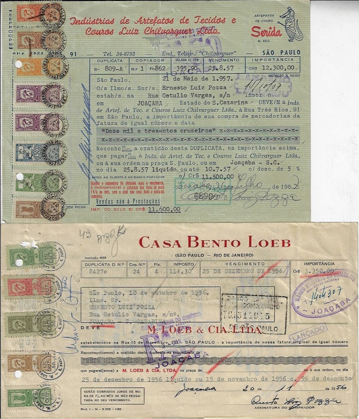 | 83349 | Brasil, 1953/1957, 12 duplicatas com 73 selos fiscais do Estado de São Paulo, todas as duplicatas com carimbos de bancos | 32,00 | Foto |