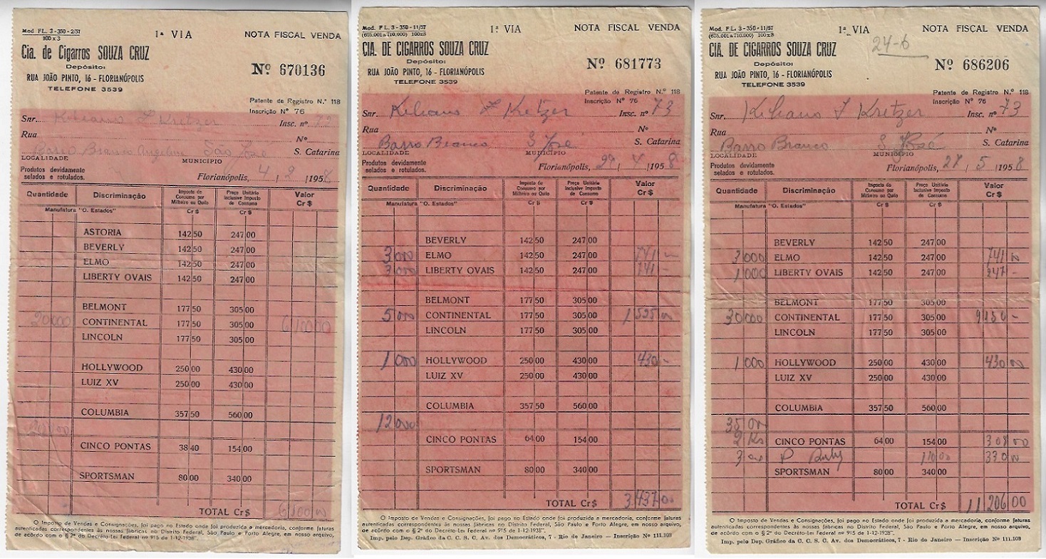 | 84358 | Brasil, 1958, 3 notas fiscais da Companhia de Cigarros Souza Cruz, de Florianópolis, tamanho 14x23 cm | 20,00 | Foto |