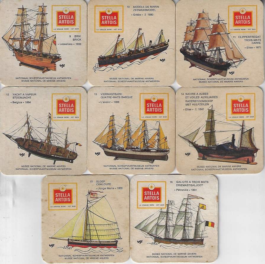 | 84479 | Bélgica, 1980s, conjunto com 8 descansos para copos retratando antigos navios, marca Cerveja Stella Artois, nº 9, 10, 11, 12, 13, 14, 15 e 16 | 16,00 | Foto |
