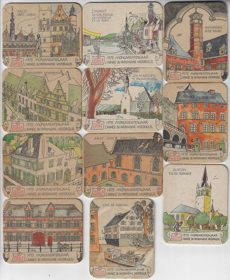 | 84481 | Bélgica, 1975, conjunto com 11 descansos para copos Ano do Patrimônio Histório, marca Cerveja Stella Artois | 22,00 | Foto |