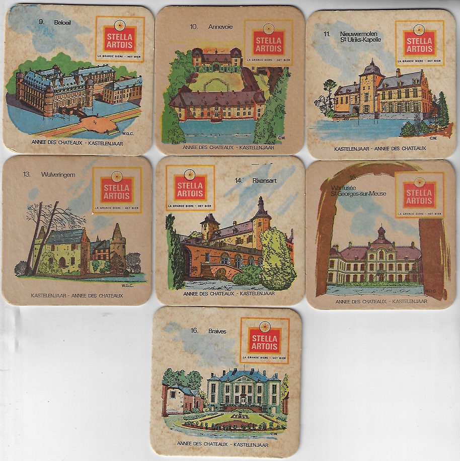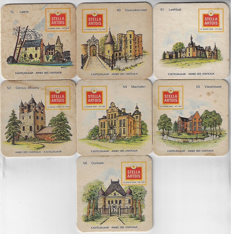 | 84483 | Bélgica, 1980s, conjunto com 7 descansos para copos Ano dos Castelos, marca Cerveja Stella Artois, nº 13, 49, 51, 52, 54, 55 e 56 | 14,00 | Foto |