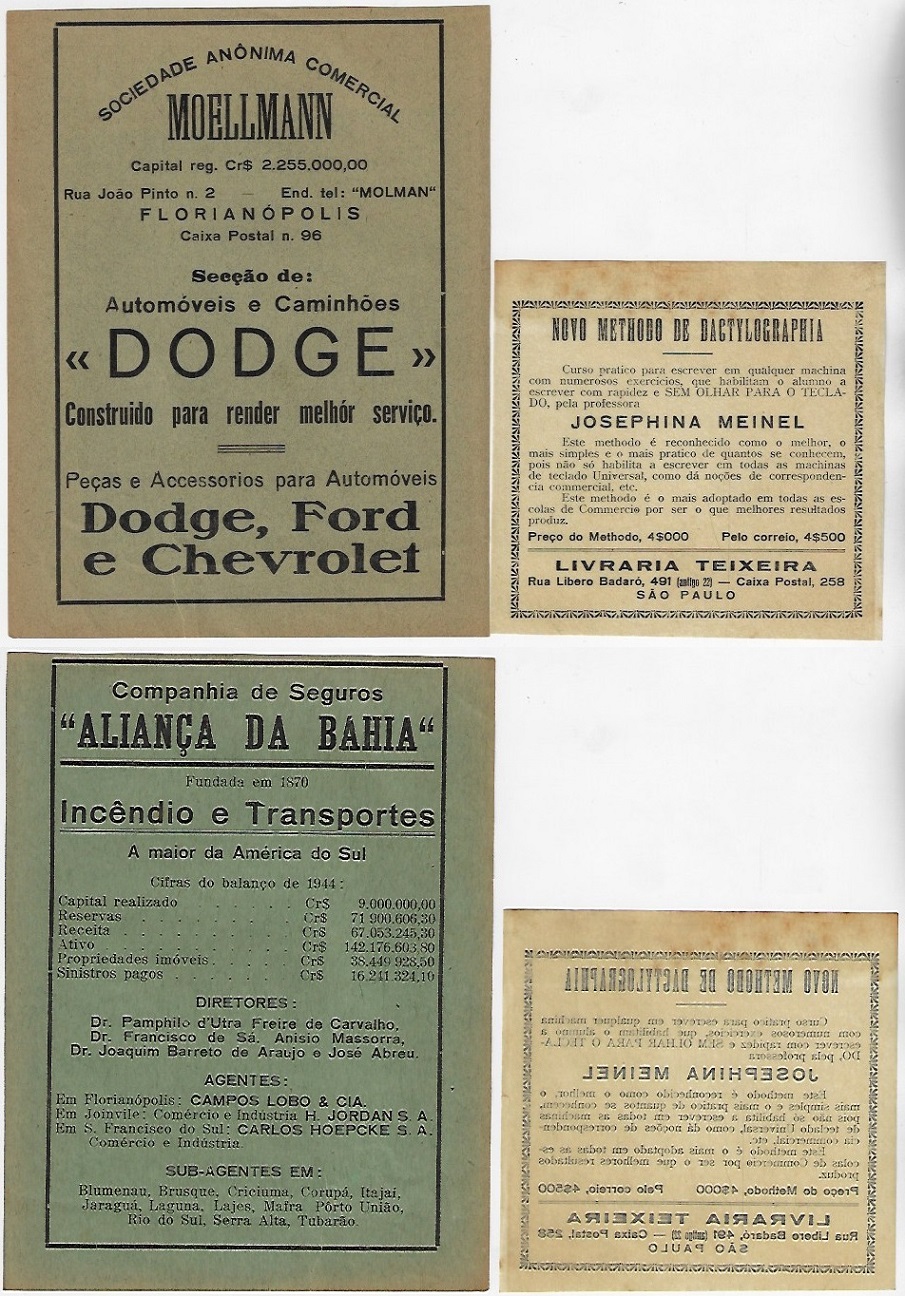 | 84567 | Brasil, 1940s, 2 folhetos de propaganda Companhia de Seguros Aliança da Bahia, Automóveis e Caminhões Dodge e Método de Datilografia | 10,00 | Foto |