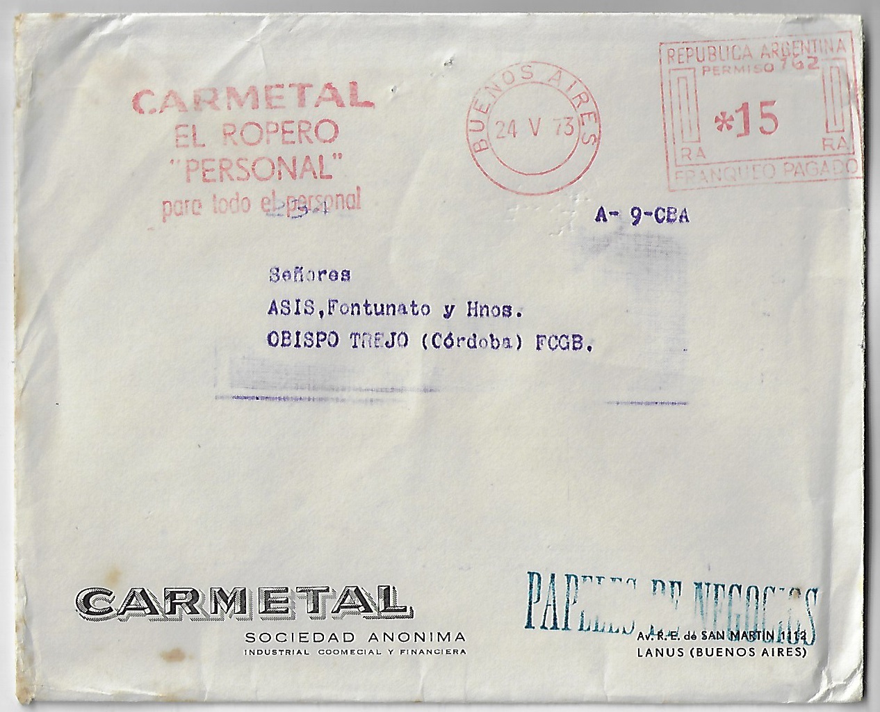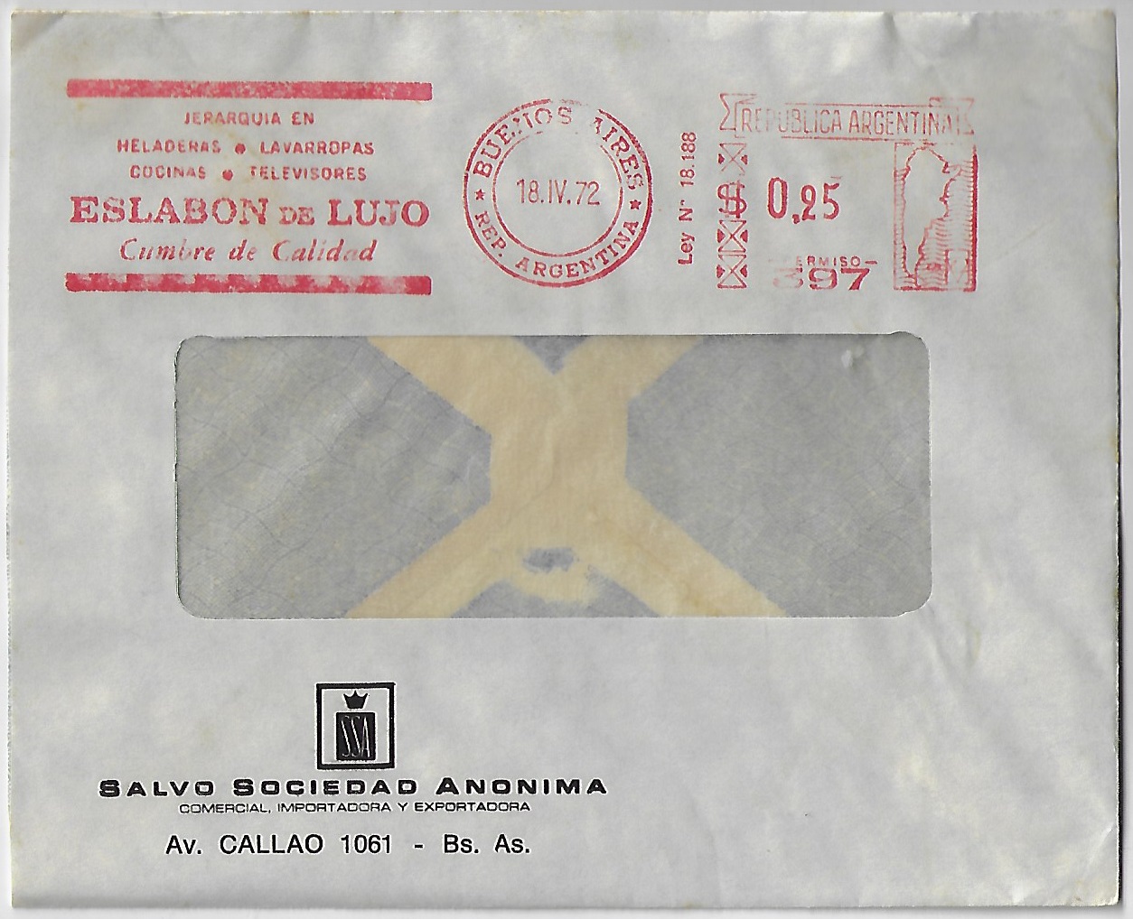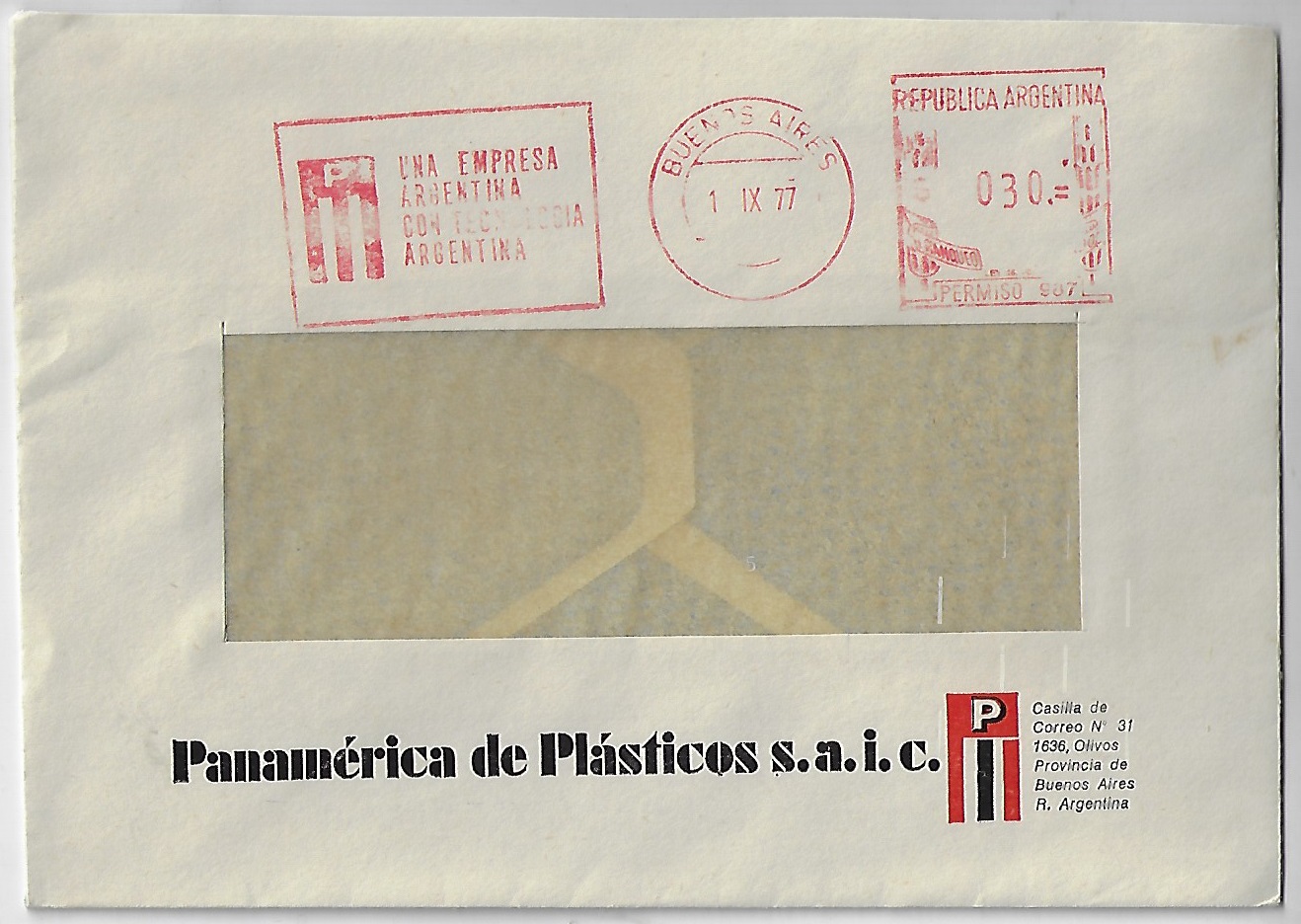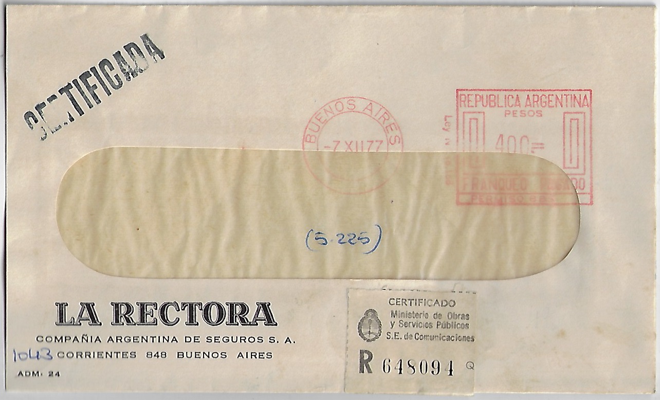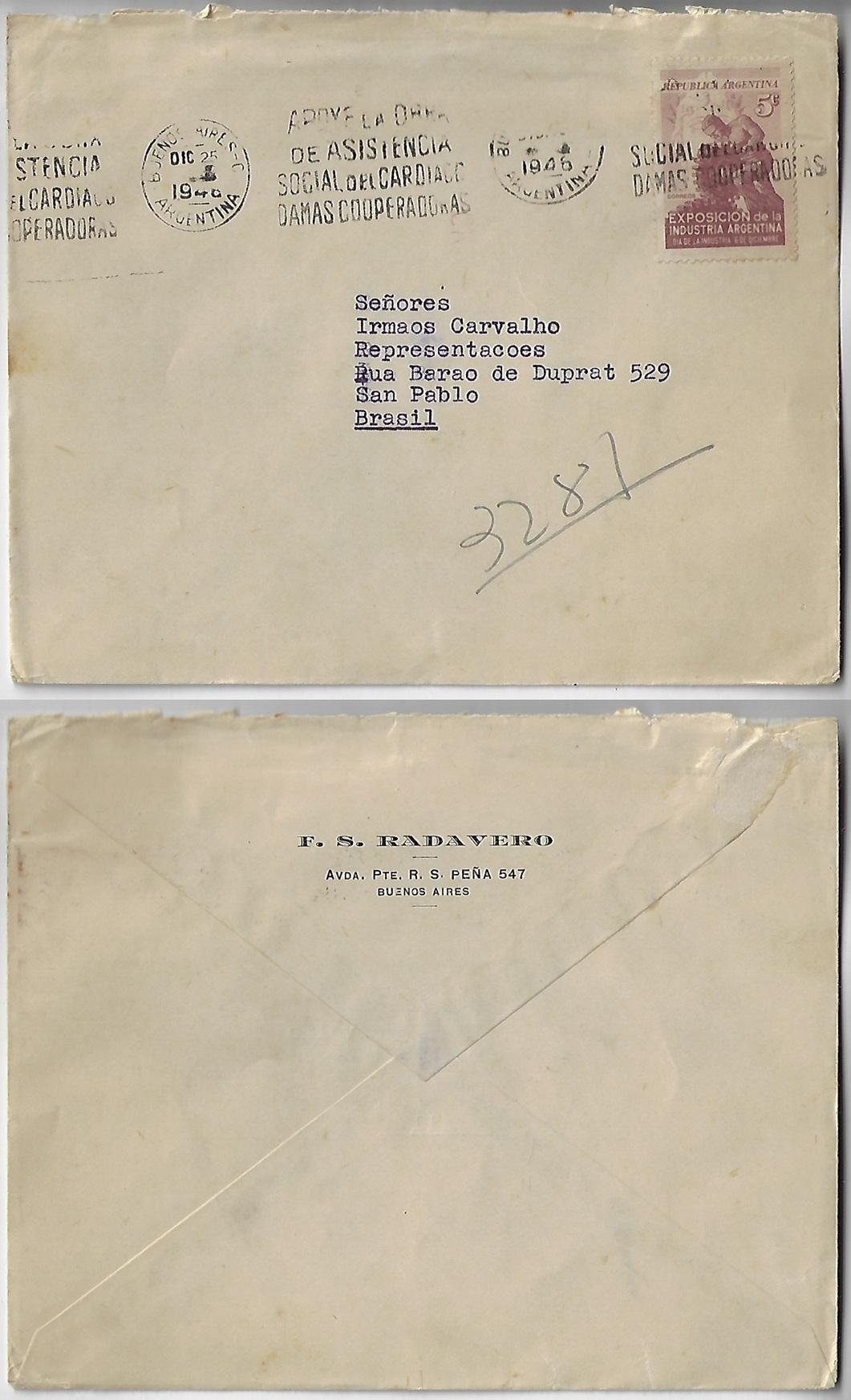 | 43069 | Argentina, 1946, envelope comercial enviado de Buenos Aires (25/12) para São Paulo, reendereçado para Caixa Postal, selo Exposição da Indústria, carimbo com slogan "Apoie a obra de Assistência Social dos Cardiopatas. Damas Cooperadas" | 10,00 | Foto |