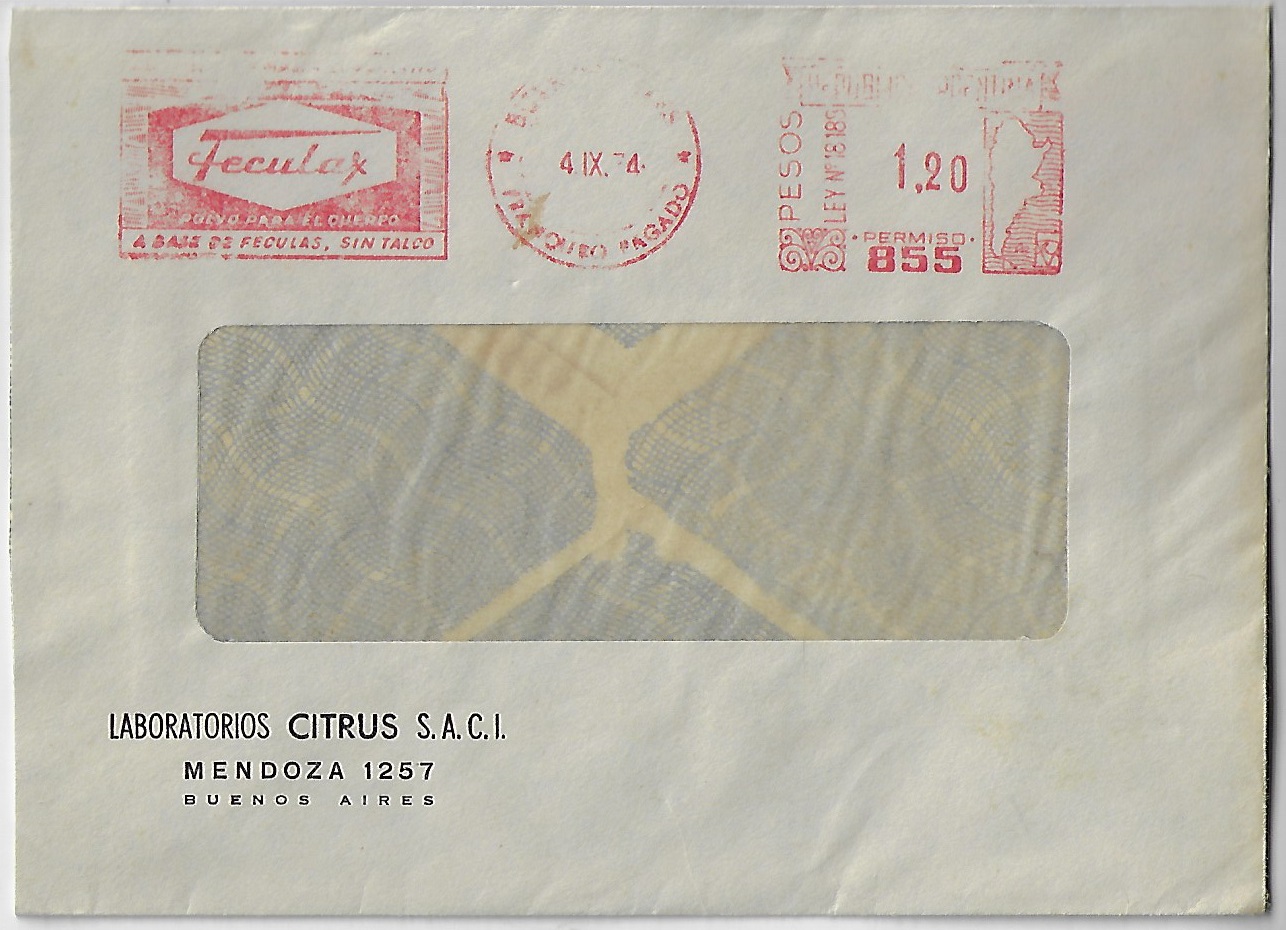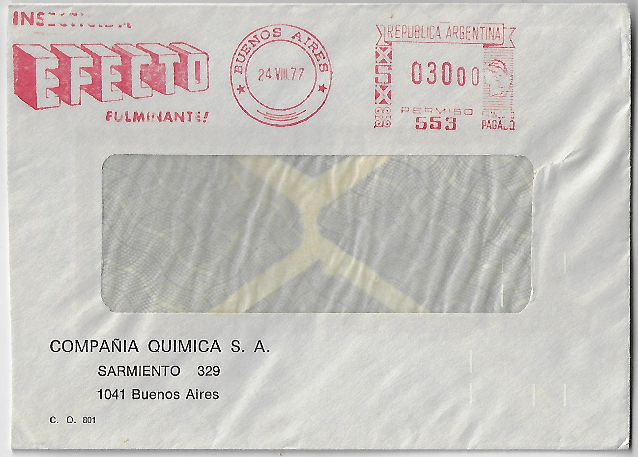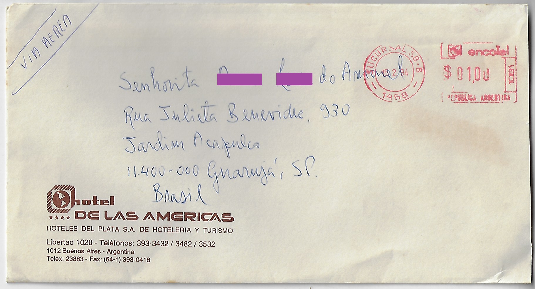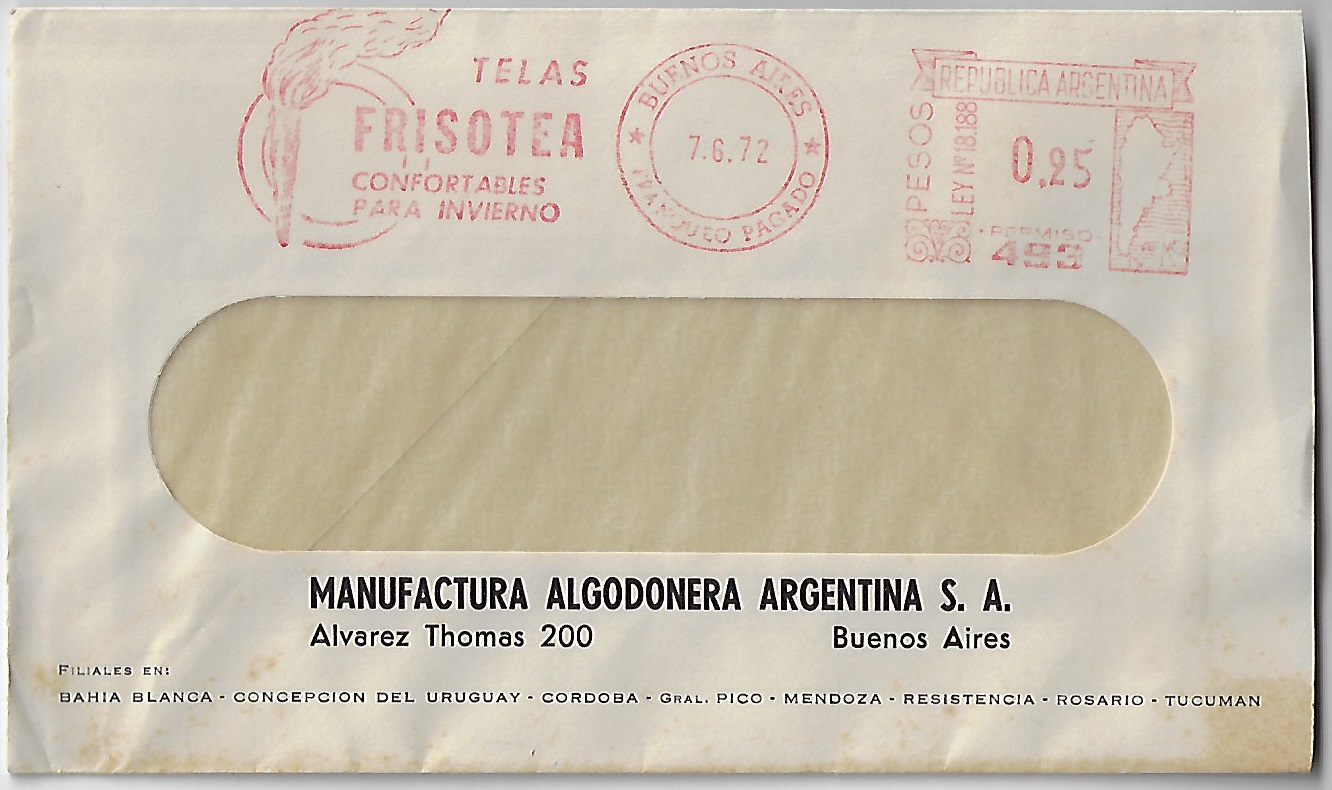 | 43069 | Argentina, 1946, envelope comercial enviado de Buenos Aires (25/12) para São Paulo, reendereçado para Caixa Postal, selo Exposição da Indústria, carimbo com slogan "Apoie a obra de Assistência Social dos Cardiopatas. Damas Cooperadas" | 10,00 | Foto |