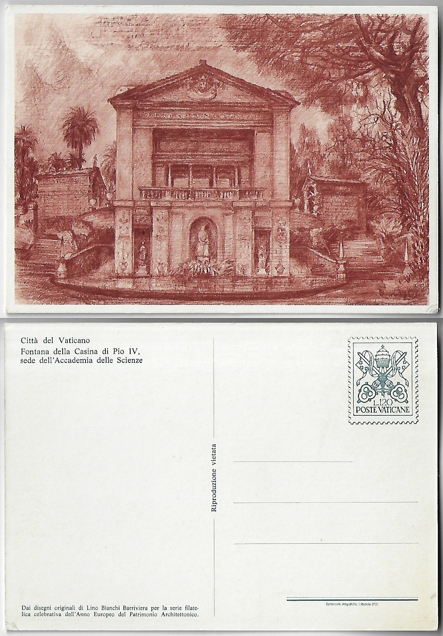 | 15292 | Vaticano, 1975, inteiro postal tipo bilhete selo Brasão 130 Liras com gravura Fonte da Casina de Pio IV, sede da Pontifícia Academia das Ciências, da série Ano Europeu do Patrimônio Arquitetônico, sem uso | 10,00 | Foto |