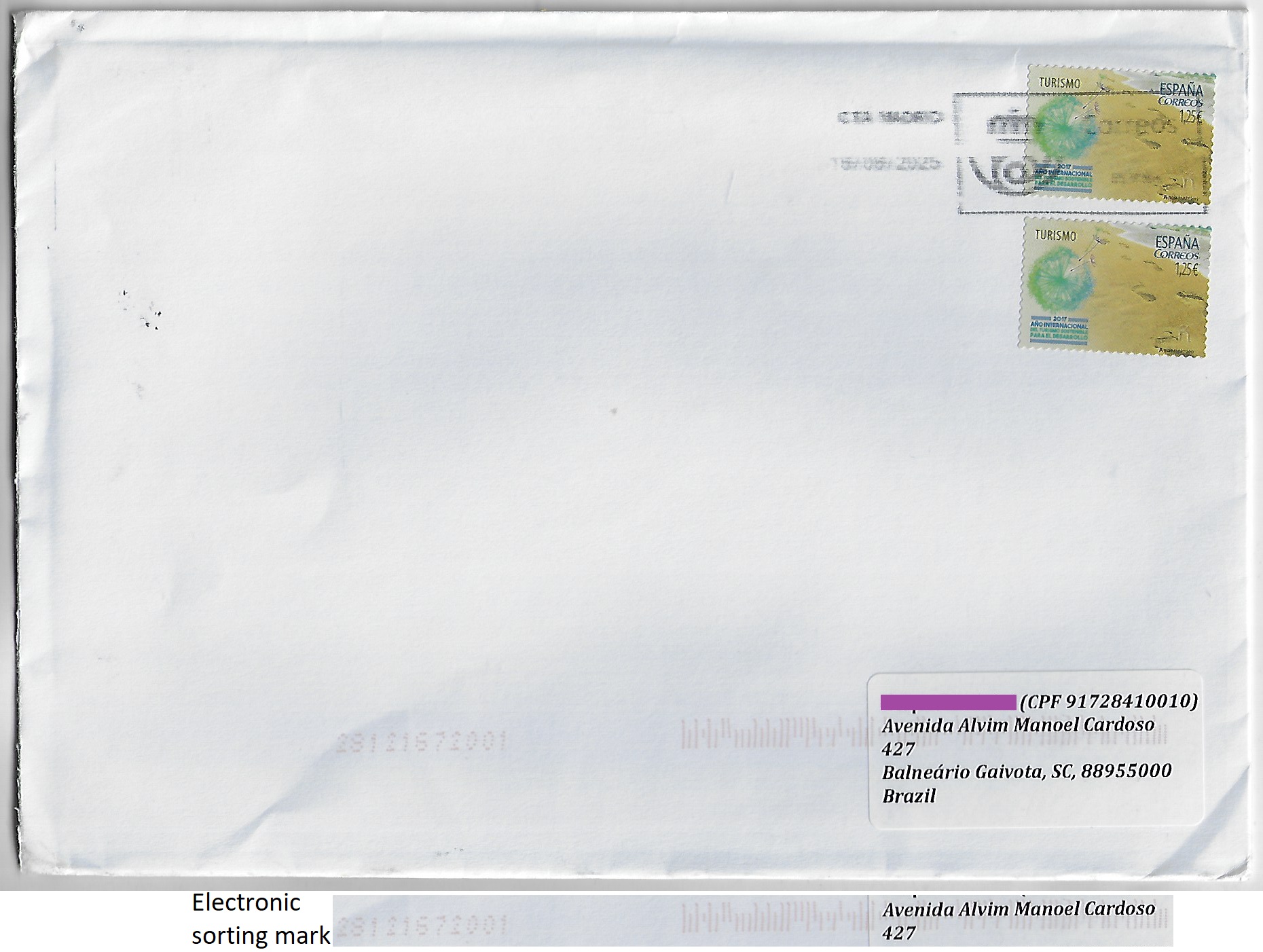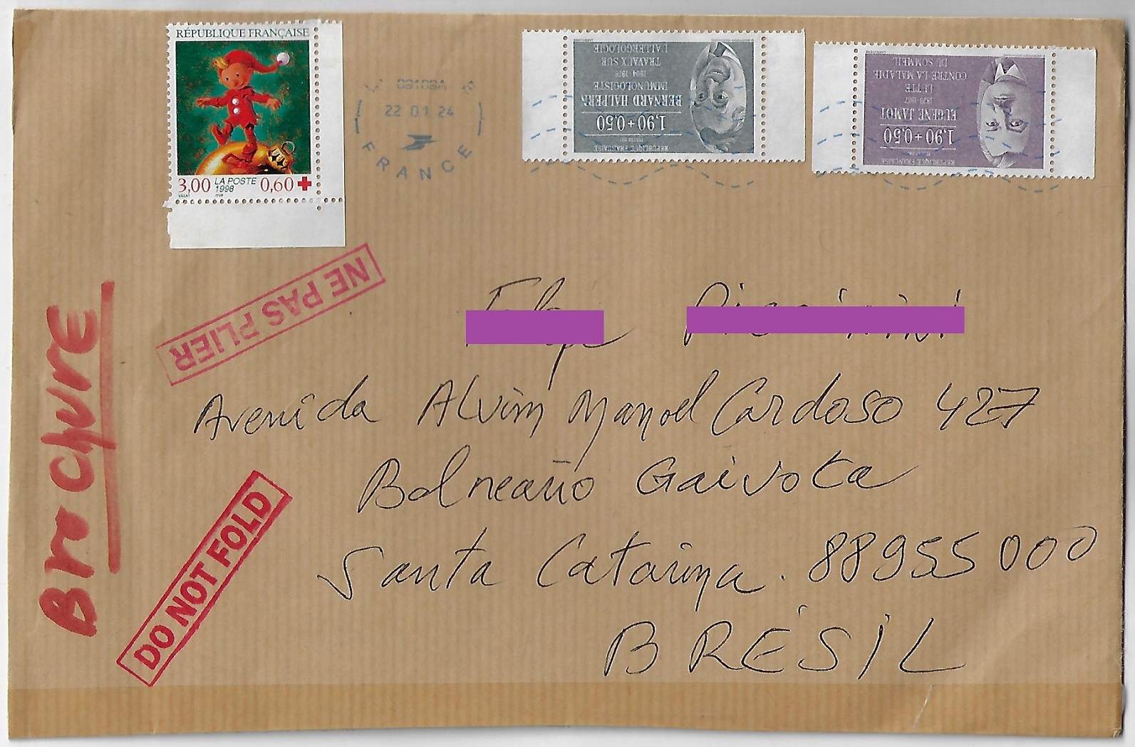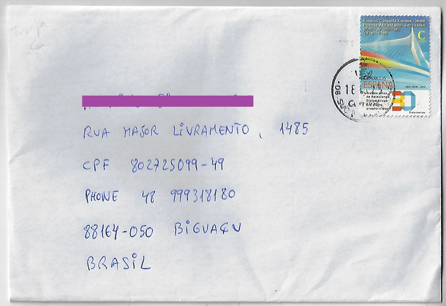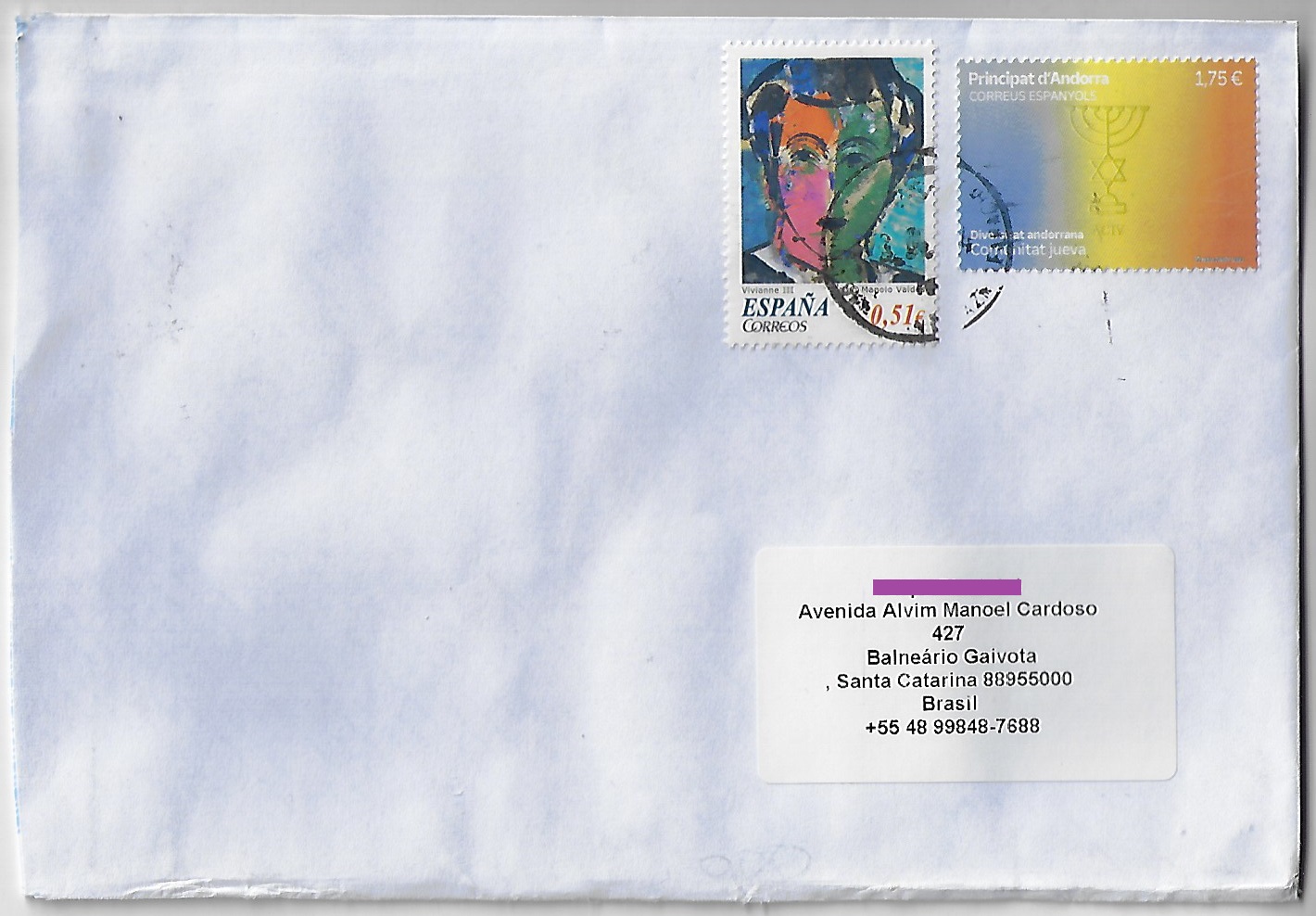 | 81260 | Andorra Espanhola, 2024, envelope enviado para Balneário Gaivota porteado com selo comemorativo Comunidade Judaica e selo espanhol pintura Vivianne III de Manolo Valdés | 10,00 | Foto |