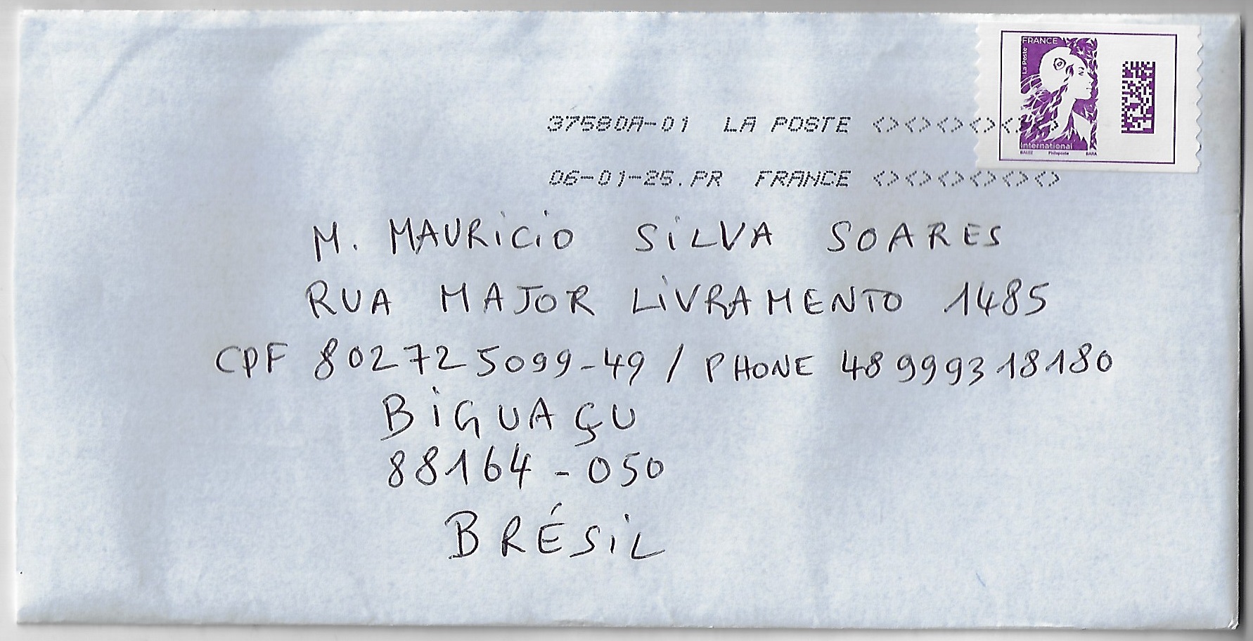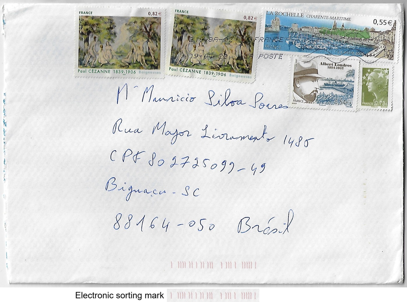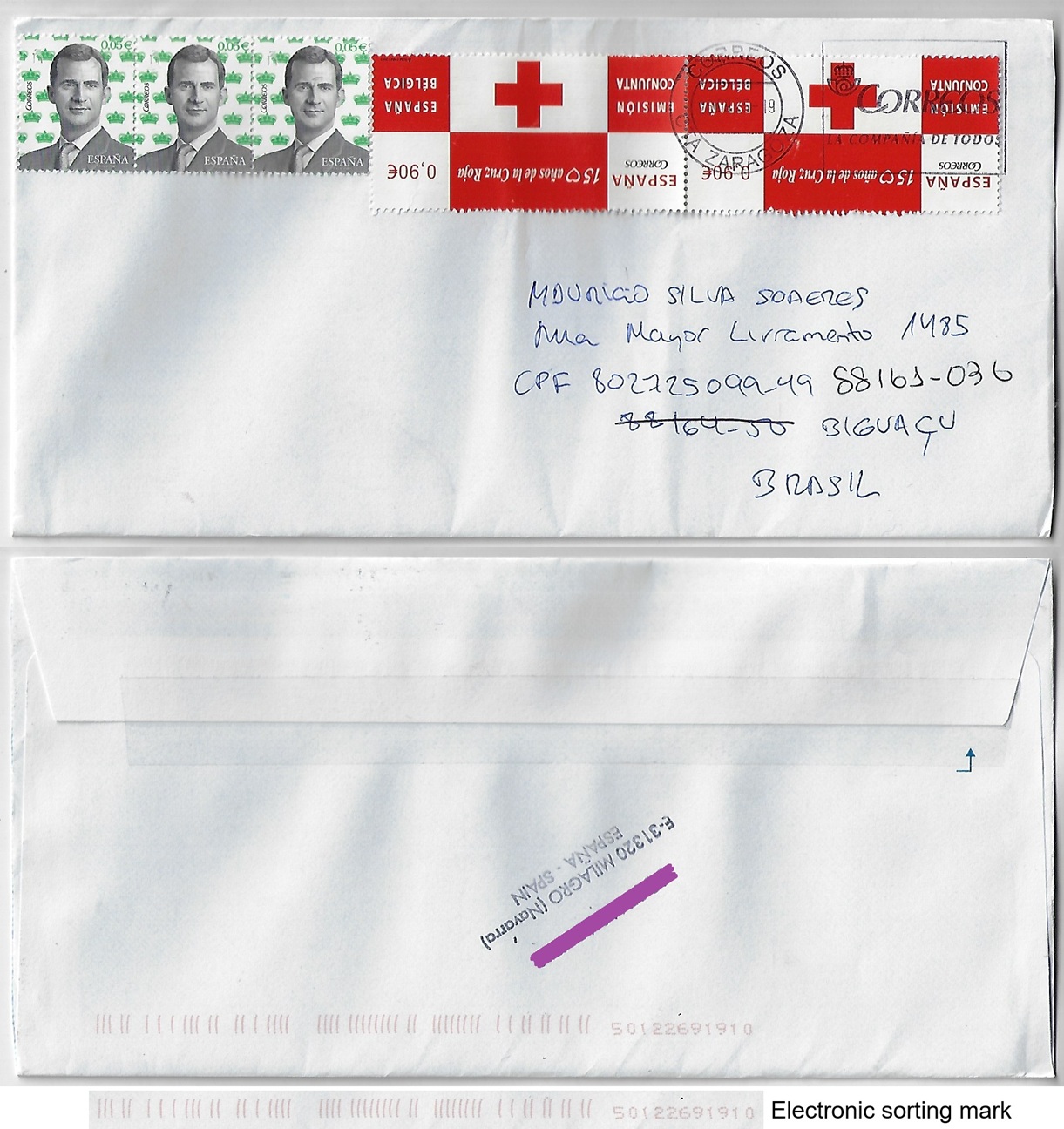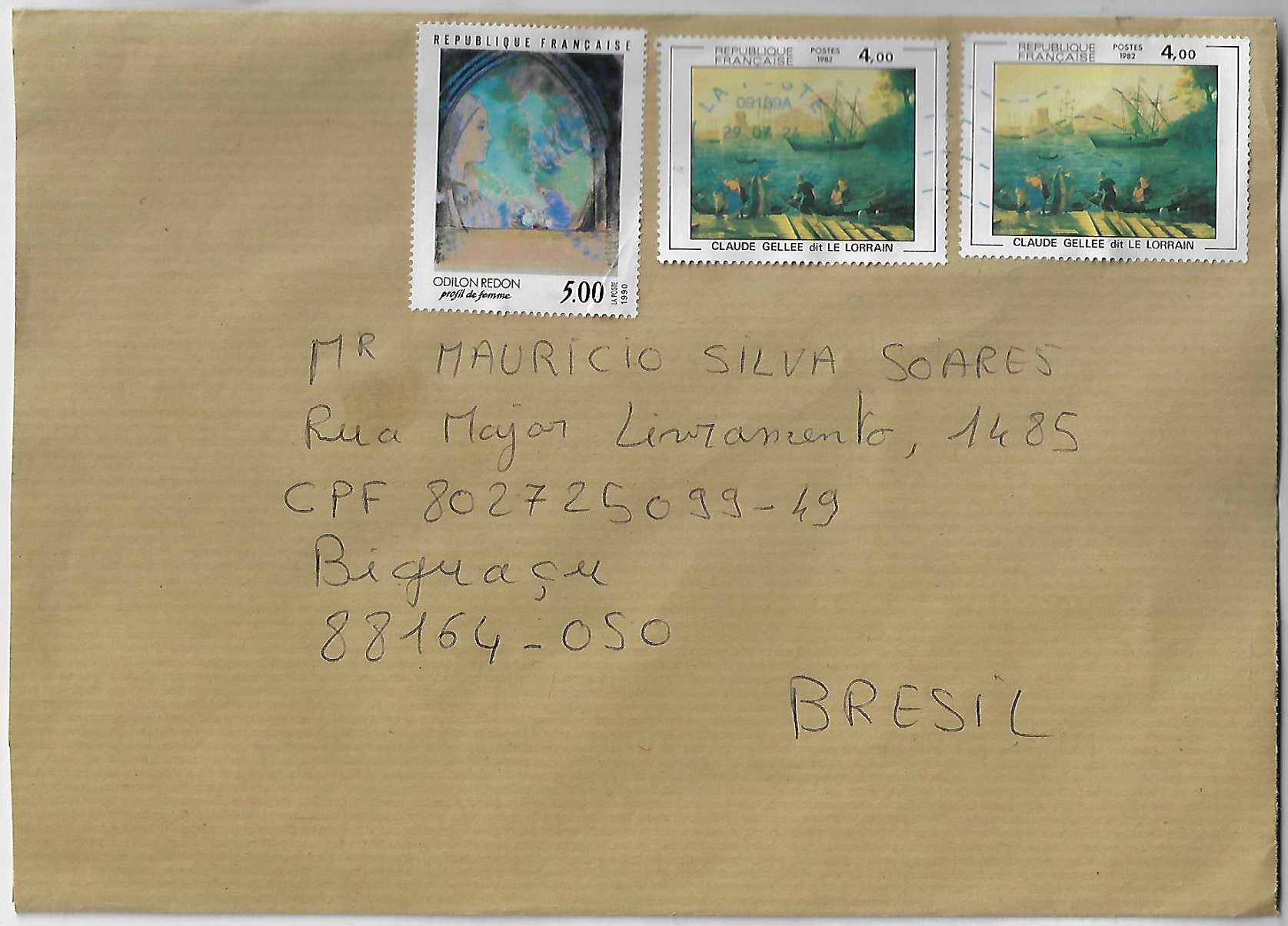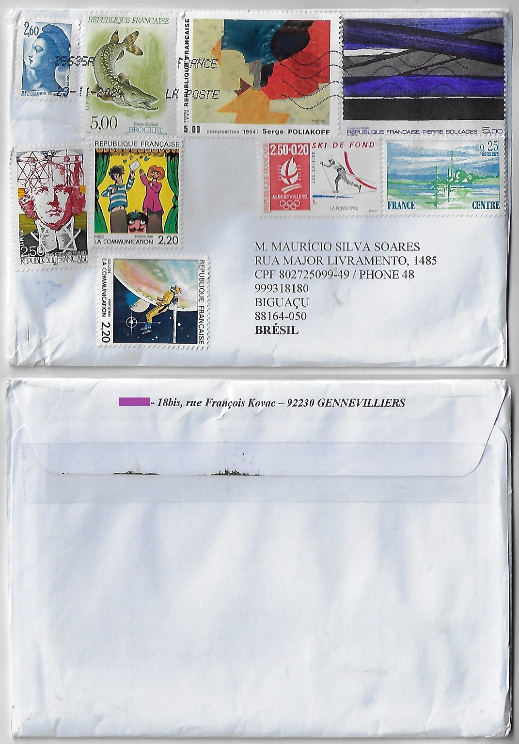 | 81260 | Andorra Espanhola, 2024, envelope enviado para Balneário Gaivota porteado com selo comemorativo Comunidade Judaica e selo espanhol pintura Vivianne III de Manolo Valdés | 10,00 | Foto |