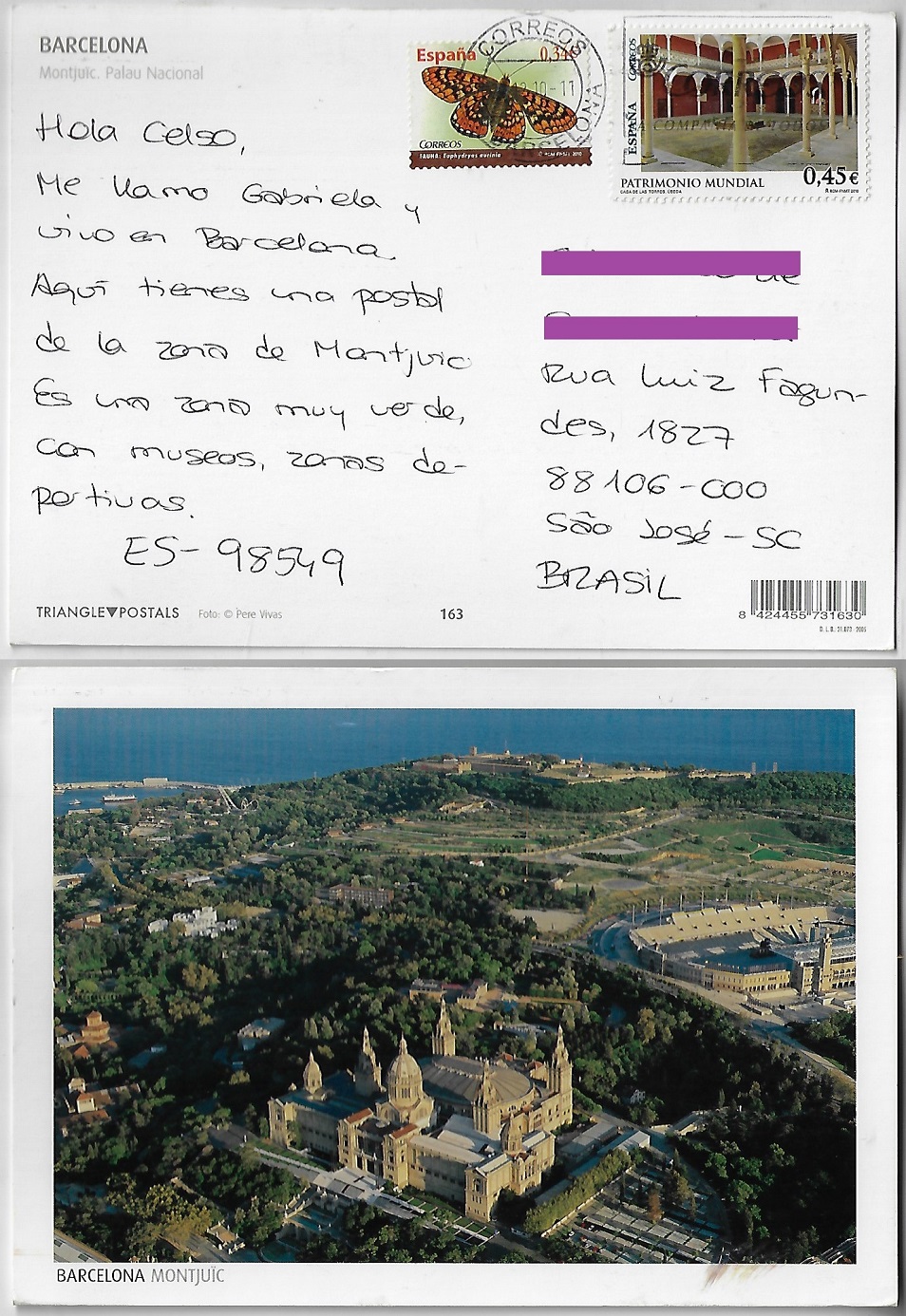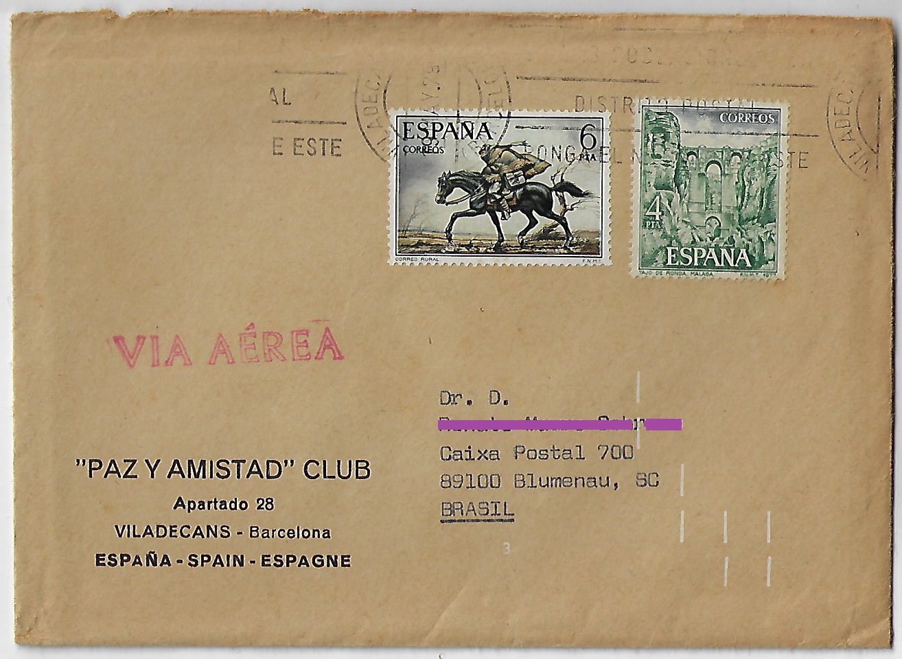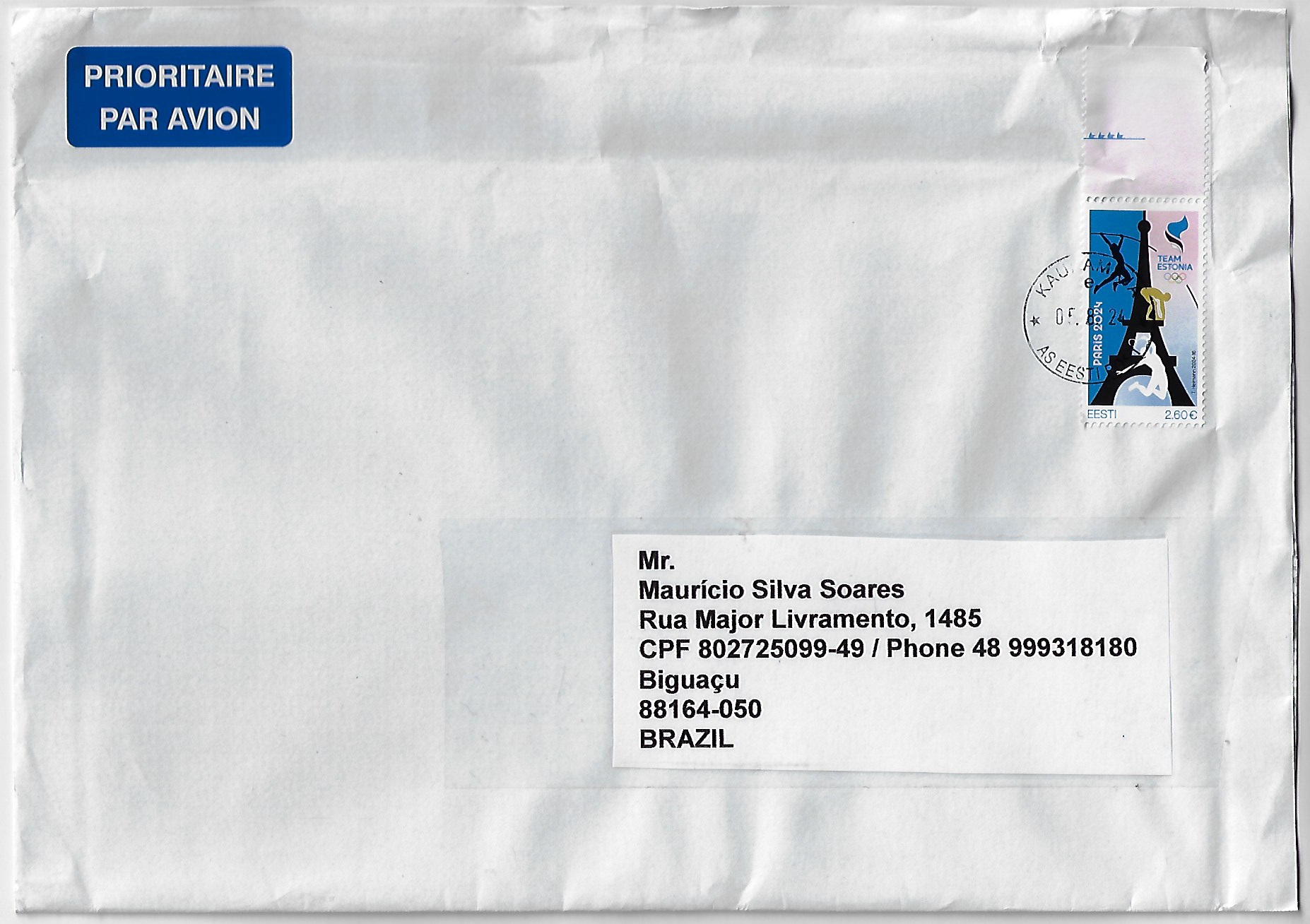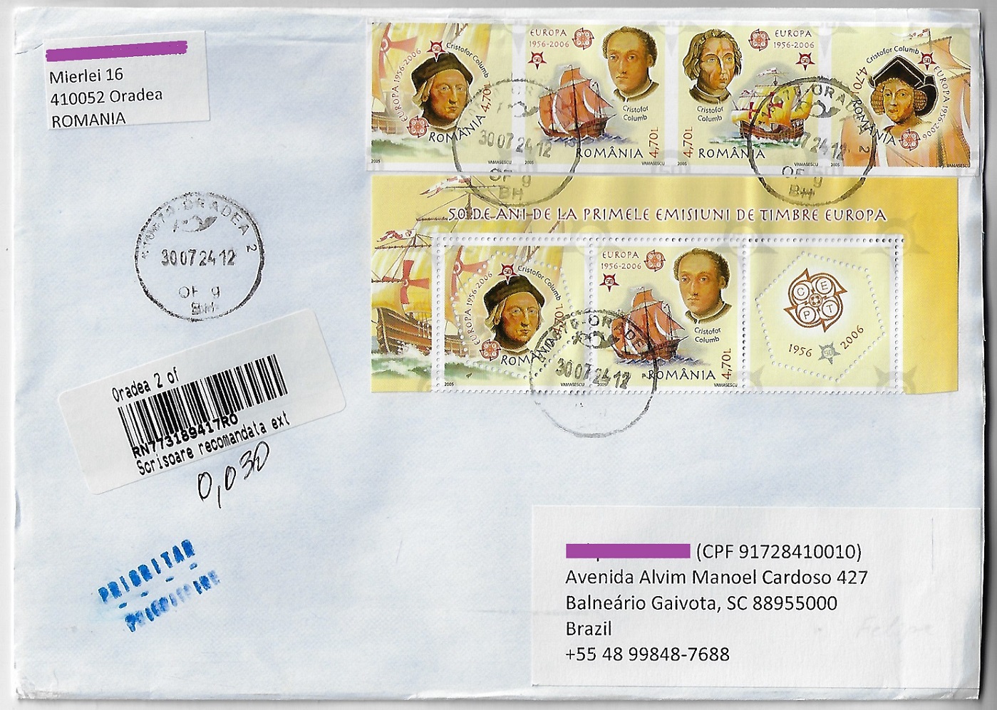 | 81260 | Andorra Espanhola, 2024, envelope enviado para Balneário Gaivota porteado com selo comemorativo Comunidade Judaica e selo espanhol pintura Vivianne III de Manolo Valdés | 10,00 | Foto |