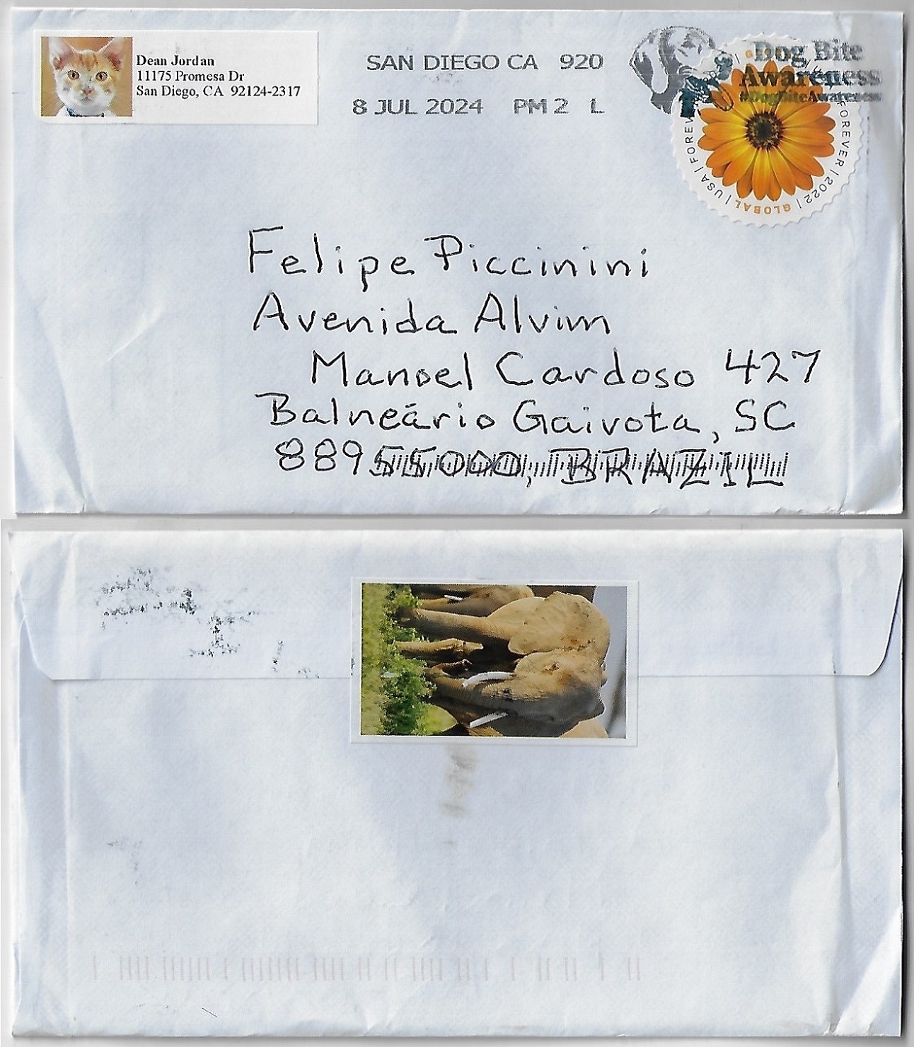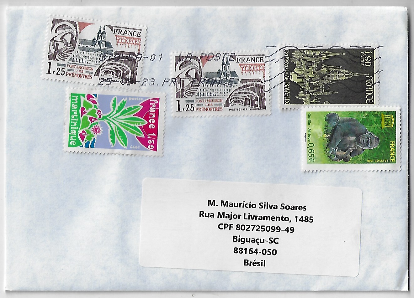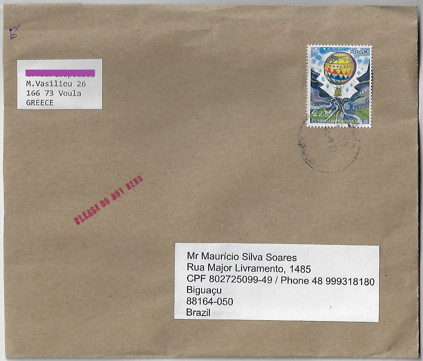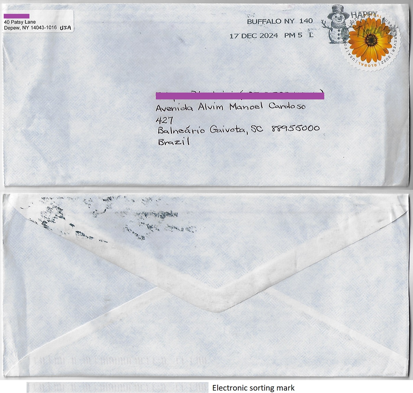 | 81260 | Andorra Espanhola, 2024, envelope enviado para Balneário Gaivota porteado com selo comemorativo Comunidade Judaica e selo espanhol pintura Vivianne III de Manolo Valdés | 10,00 | Foto |