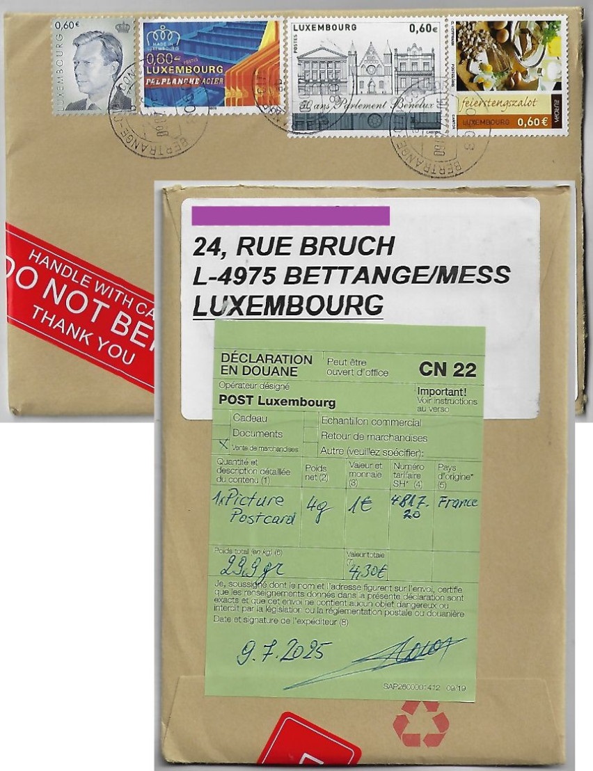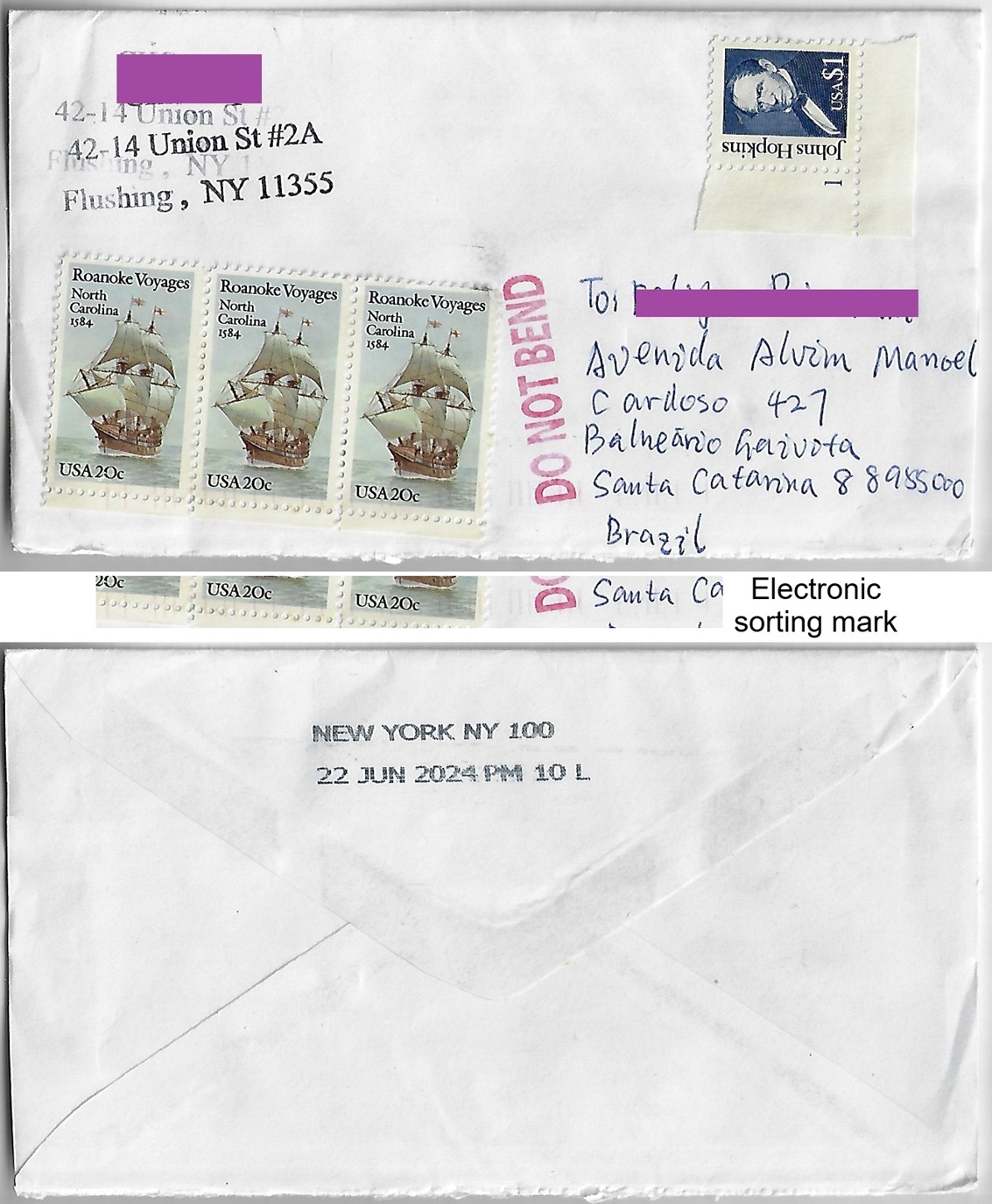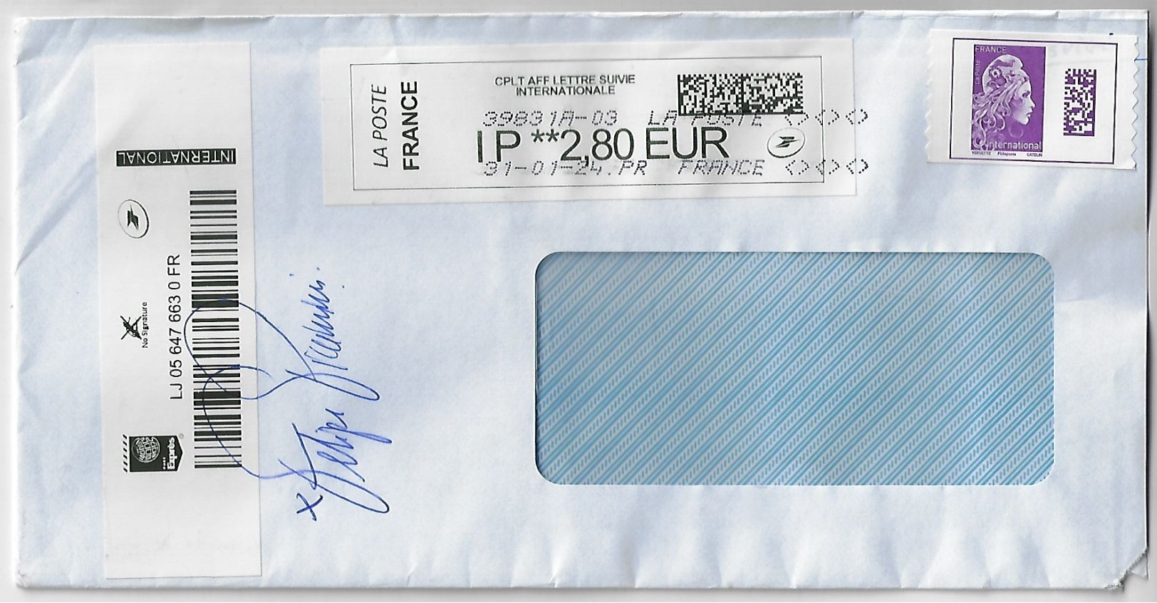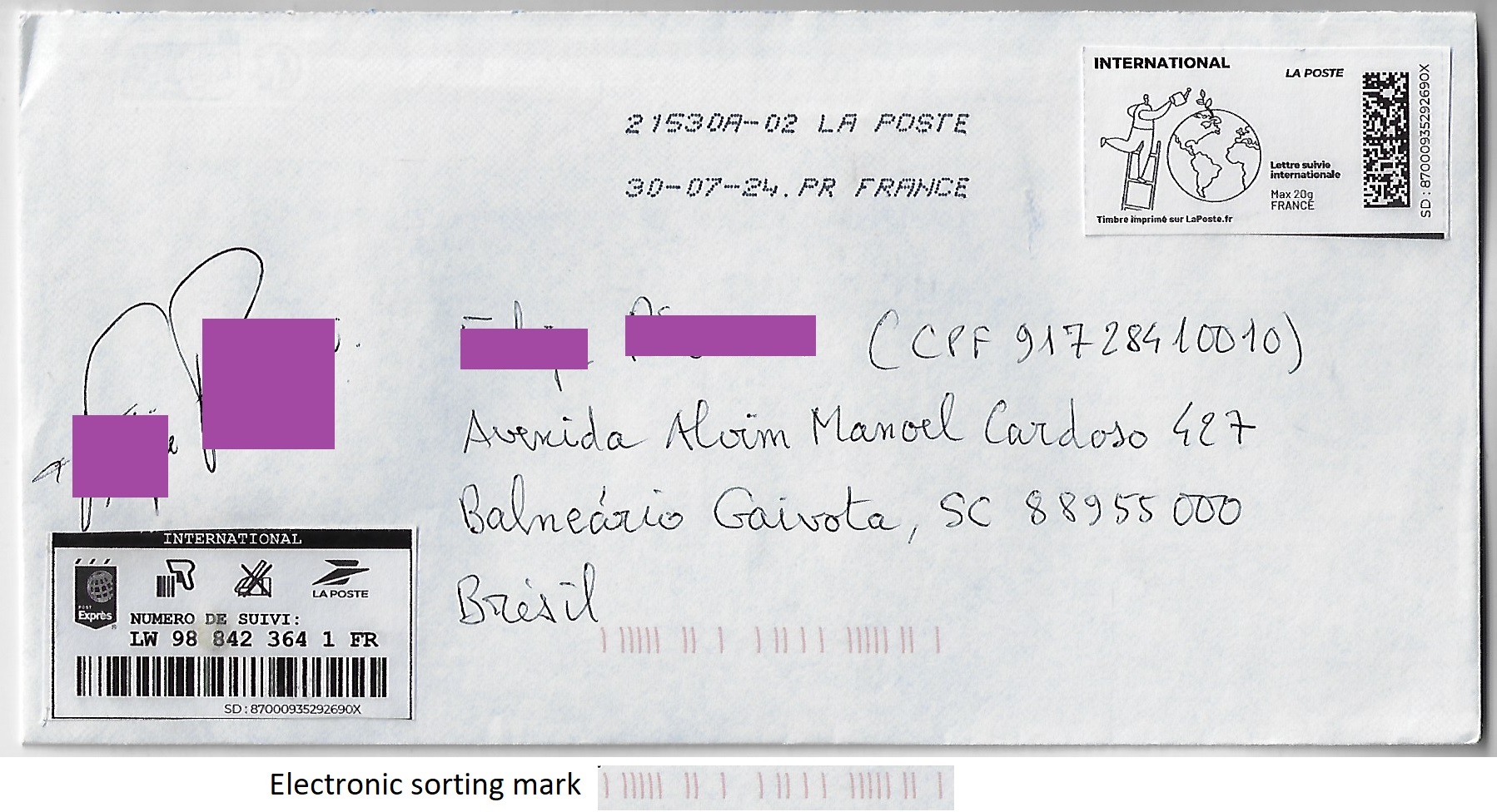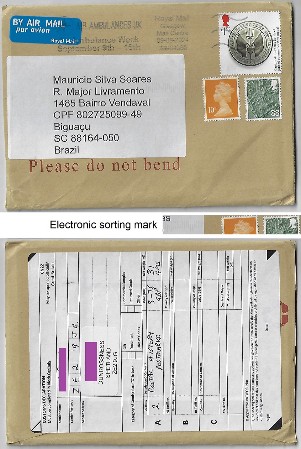 | 81260 | Andorra Espanhola, 2024, envelope enviado para Balneário Gaivota porteado com selo comemorativo Comunidade Judaica e selo espanhol pintura Vivianne III de Manolo Valdés | 10,00 | Foto |