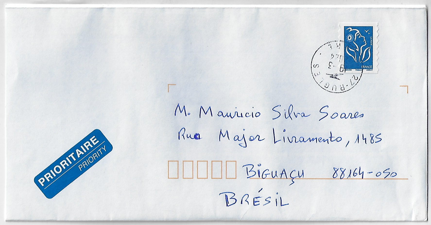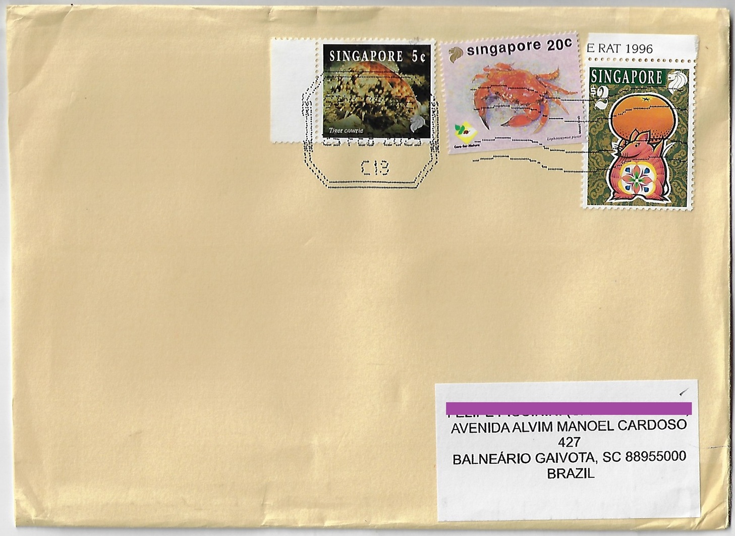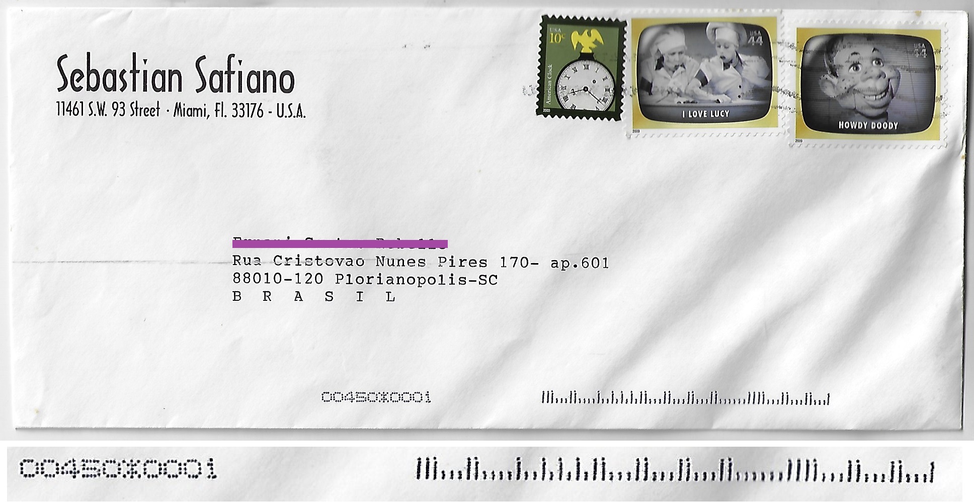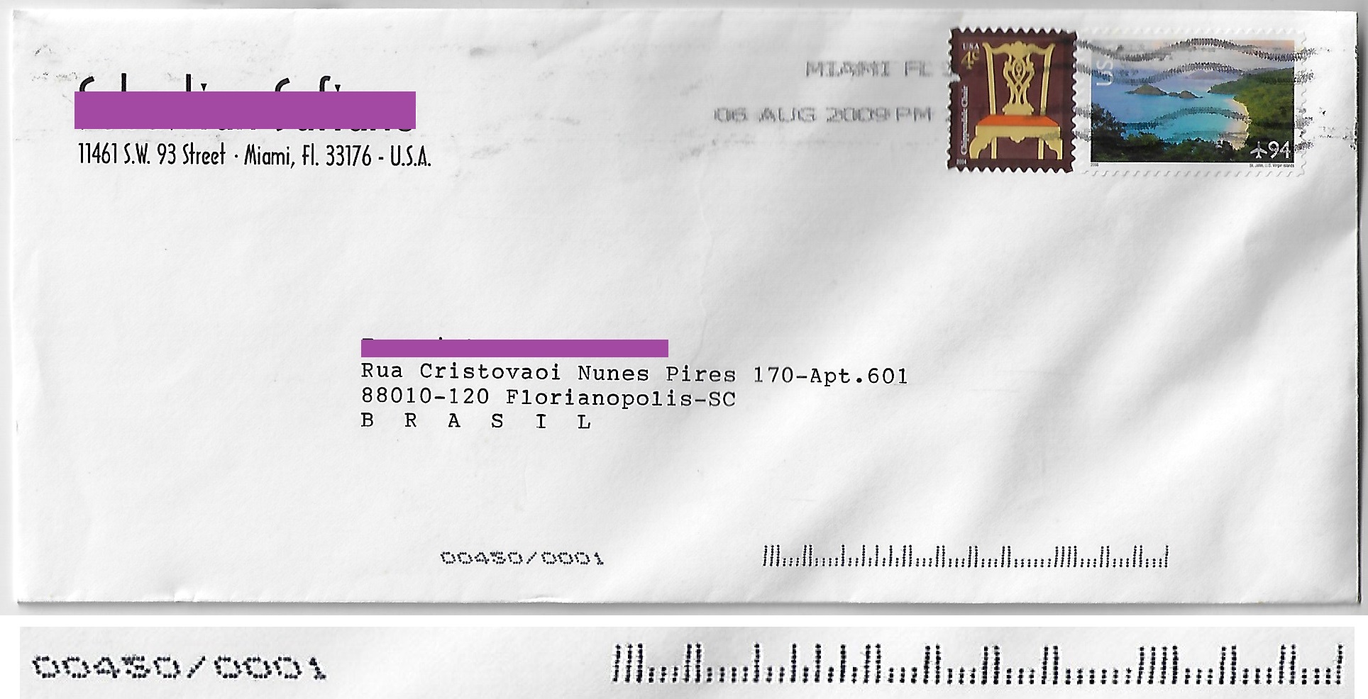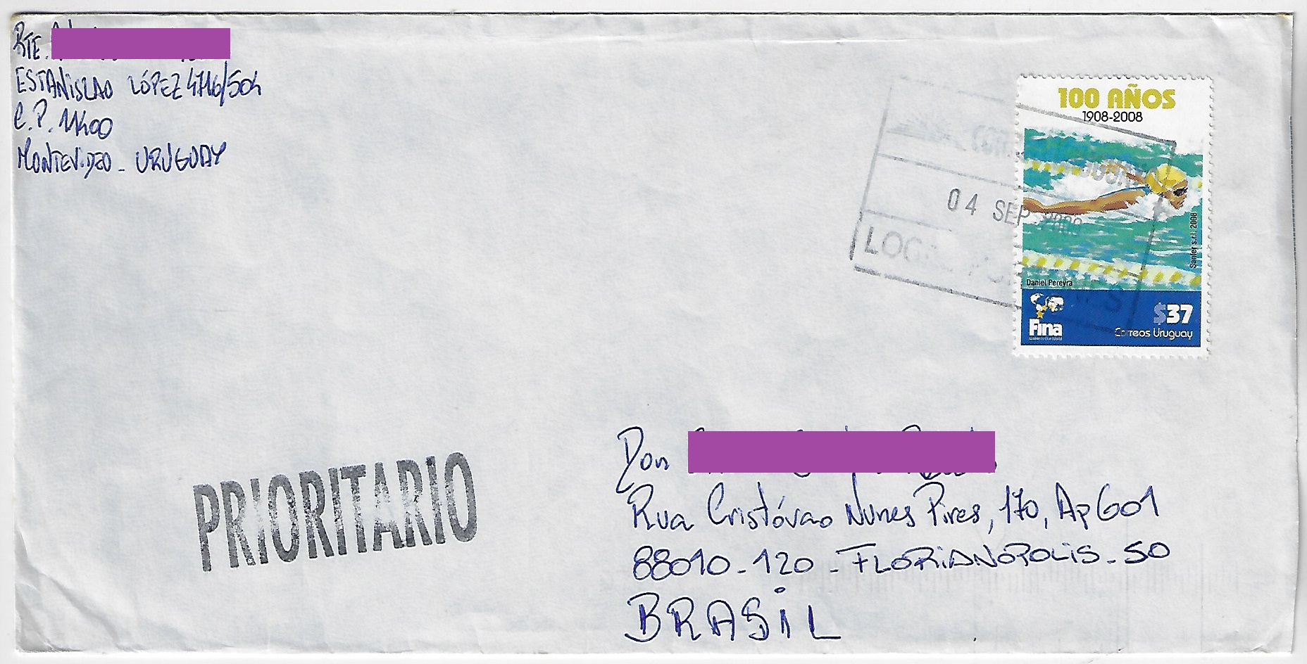 | 50831 | Uruguai, 2009, envelope prioritário de Montevidéu (4/9) para Florianópolis, selo Esporte, Natação, marcas de triagem eletrônica | 10,00 | Foto |