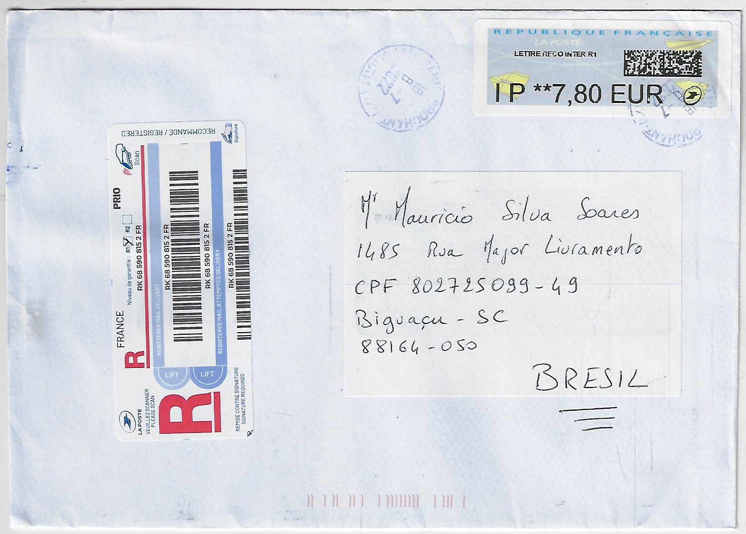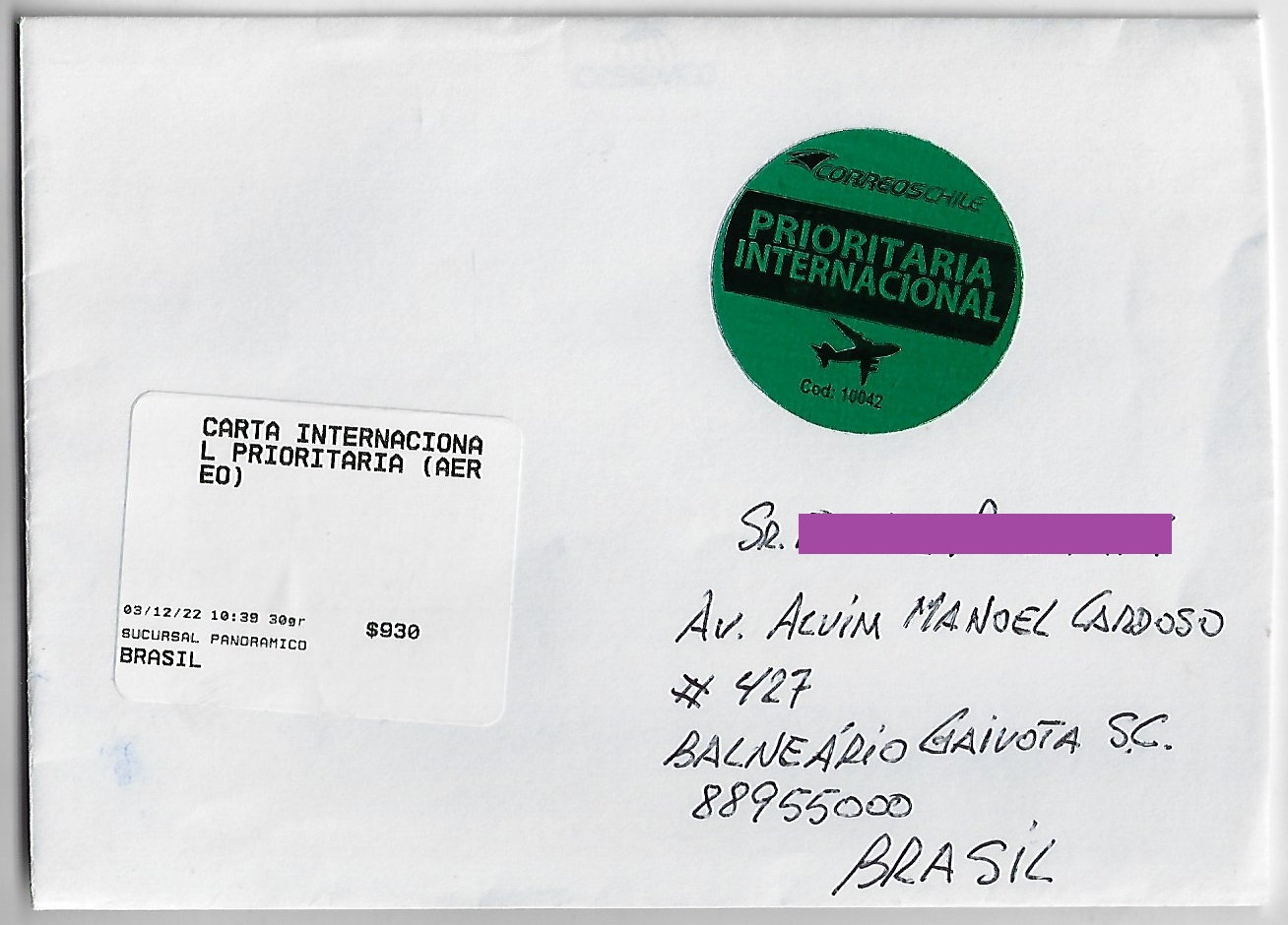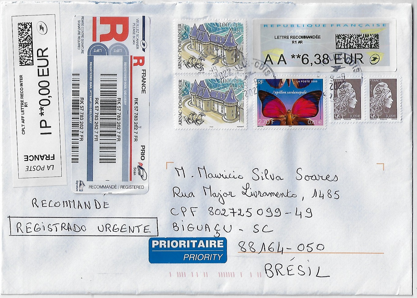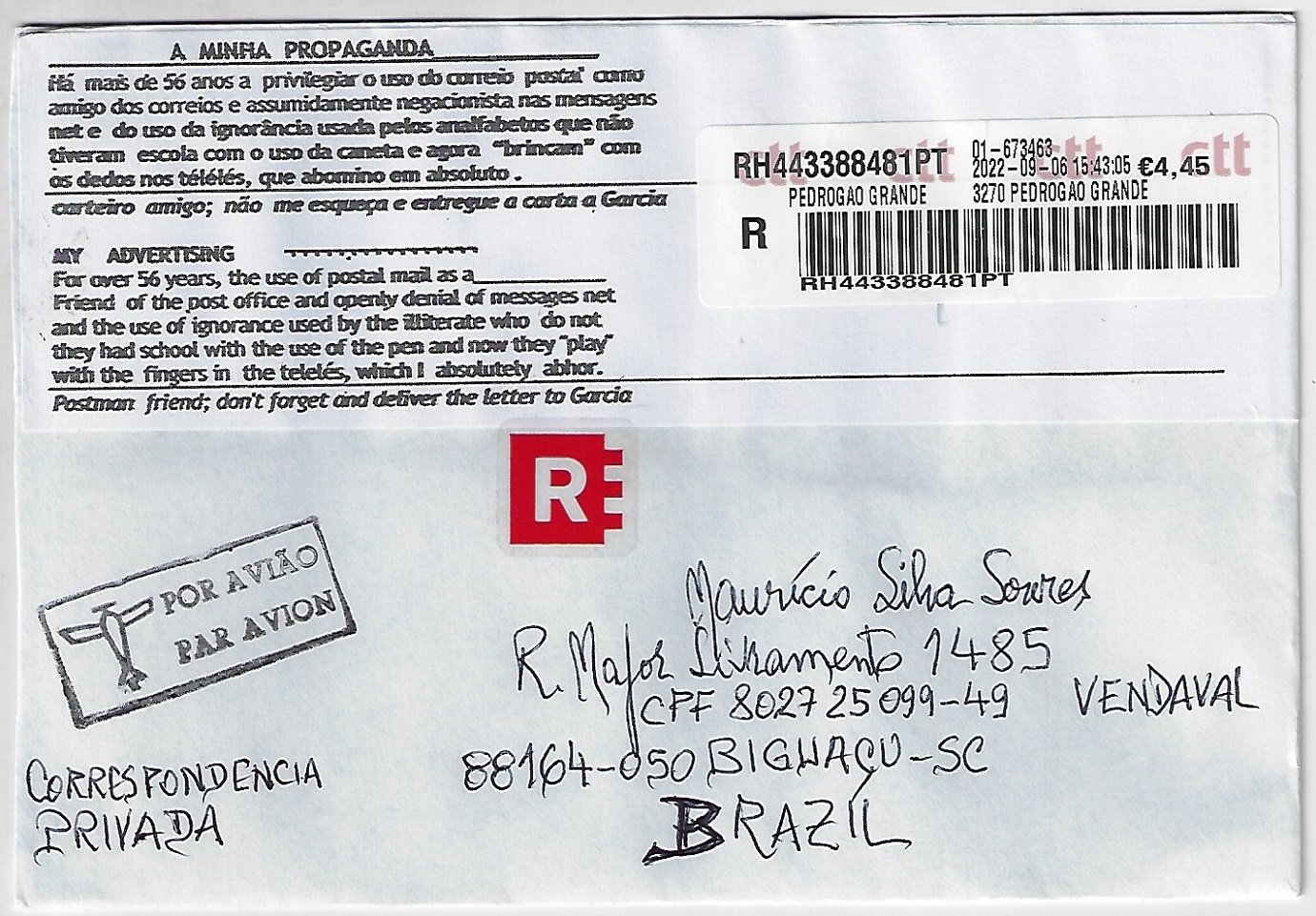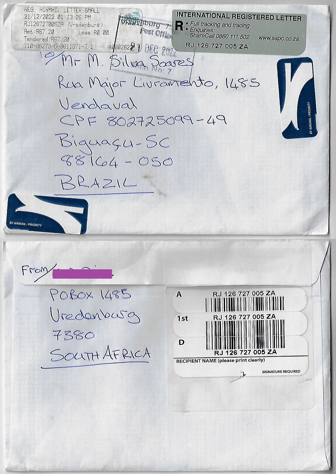| 84865 | África do Sul, 2022, envelope prioritário registrado enviado de Vredenburg (21/12) para Biguaçu, porteado com franquia mecânica Web RePost (aka "PAT Label") | 10,00 | Foto |