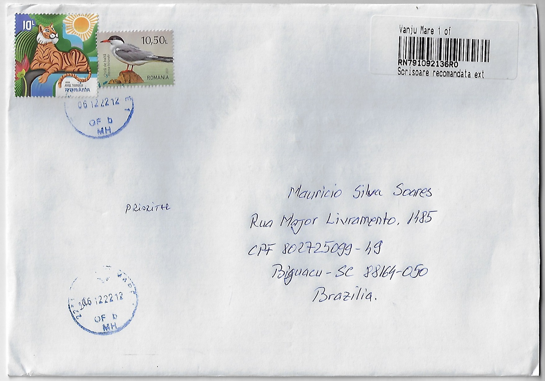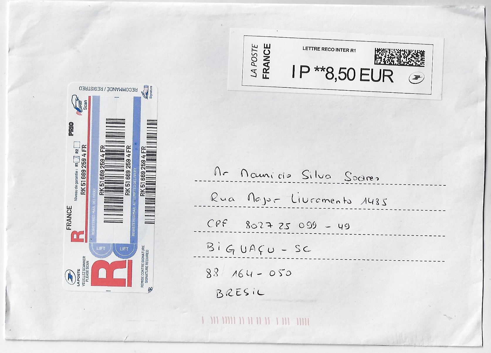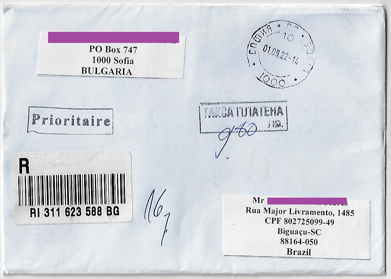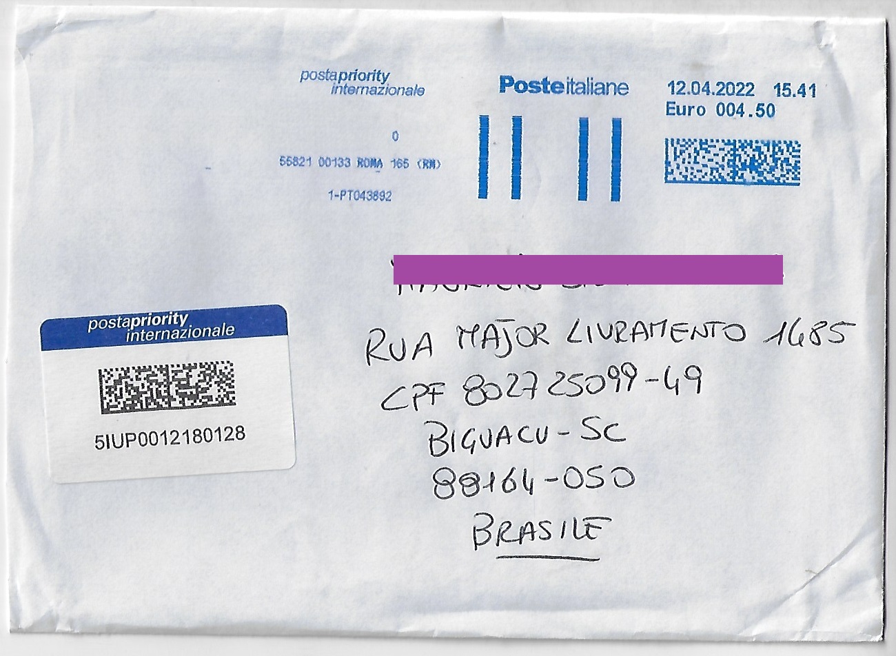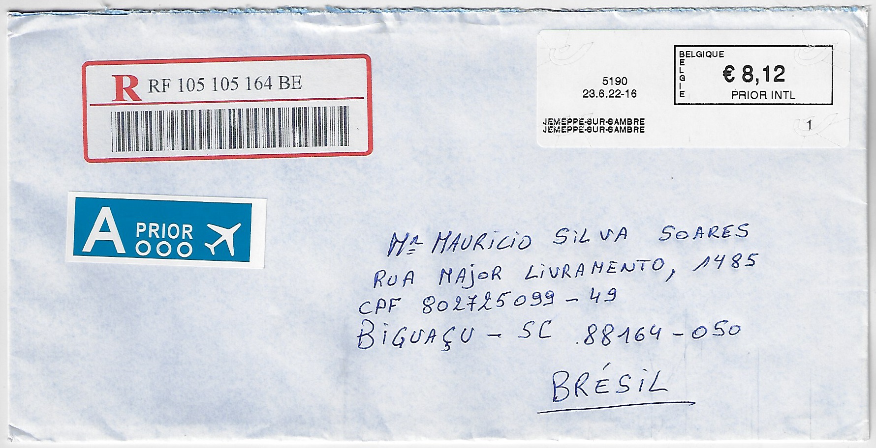 | 84865 | África do Sul, 2022, envelope prioritário registrado enviado de Vredenburg (21/12) para Biguaçu, porteado com franquia mecânica Web RePost (aka "PAT Label") | 10,00 | Foto |