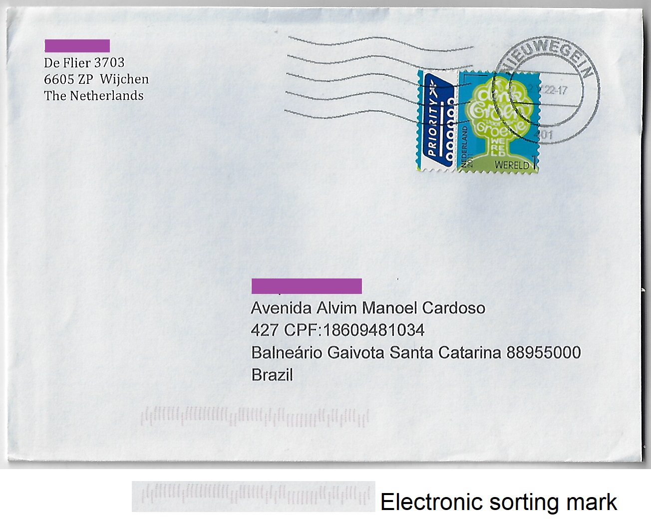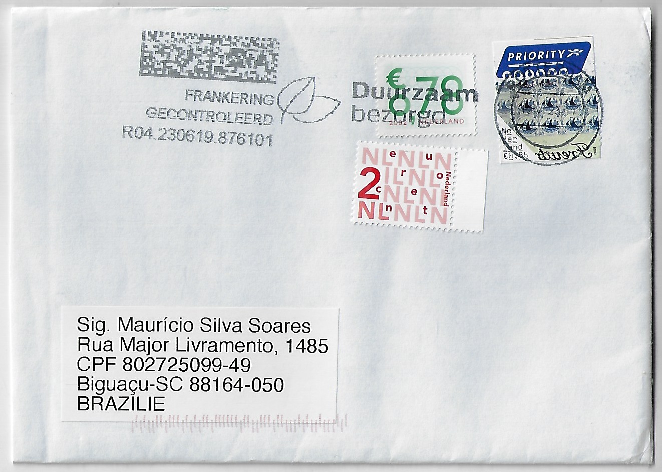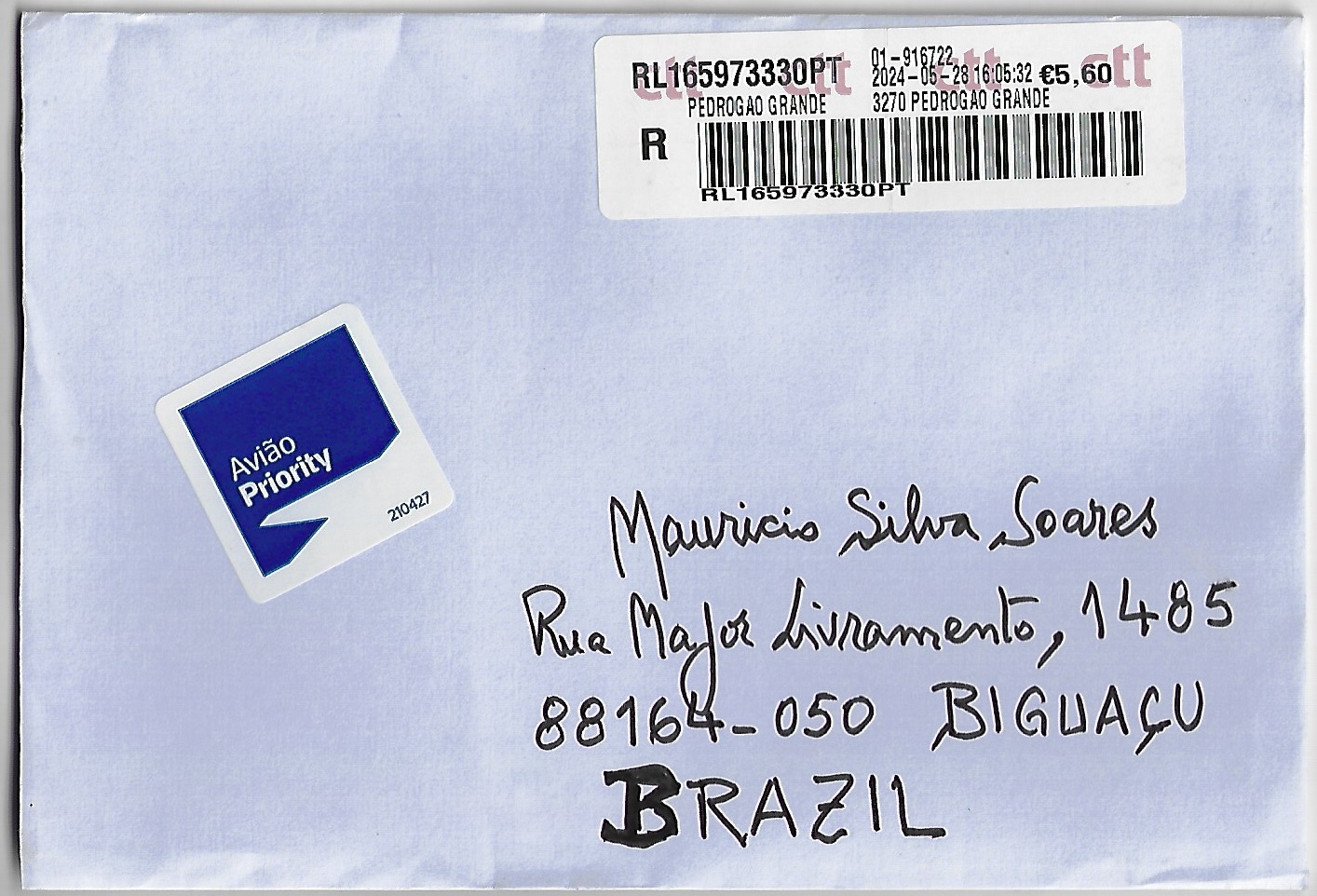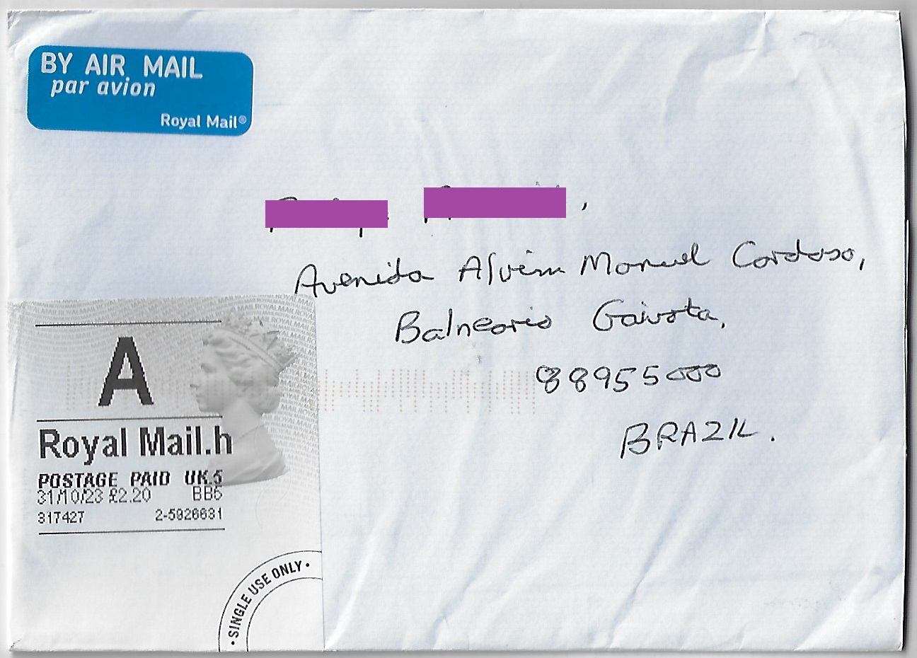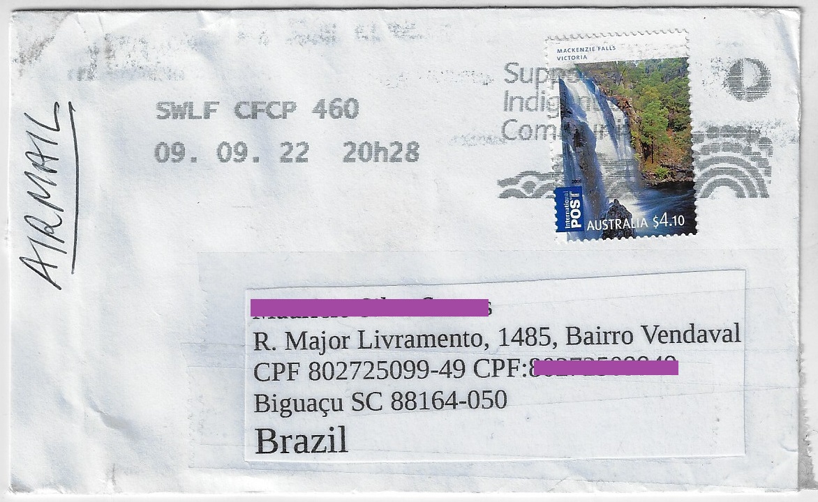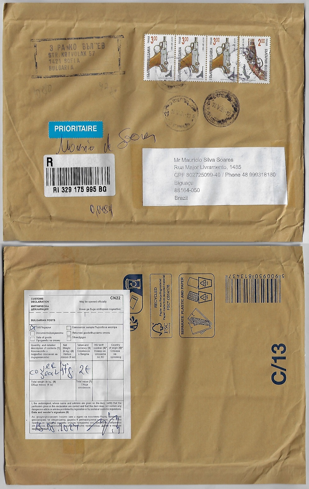 | 84865 | África do Sul, 2022, envelope prioritário registrado enviado de Vredenburg (21/12) para Biguaçu, porteado com franquia mecânica Web RePost (aka "PAT Label") | 10,00 | Foto |