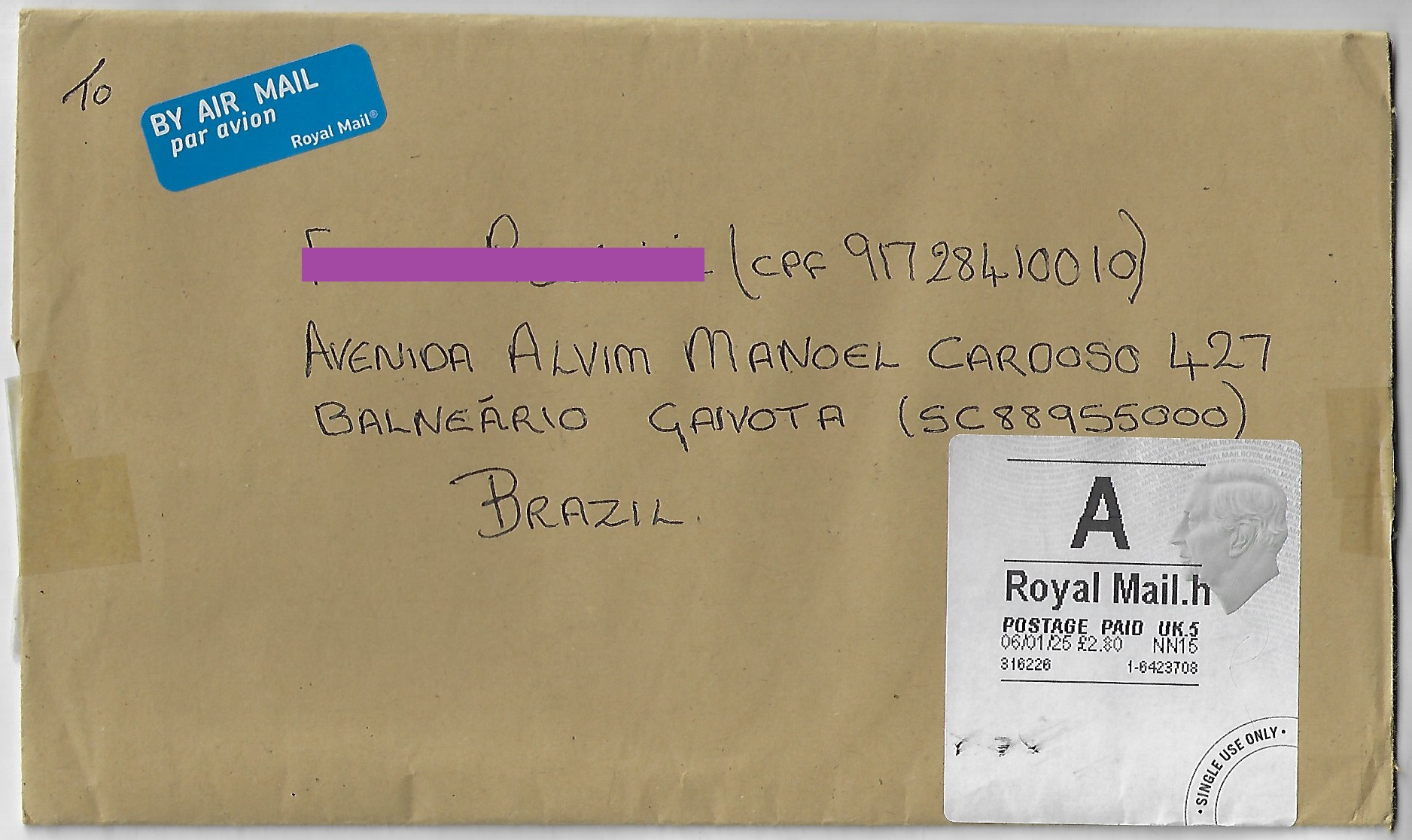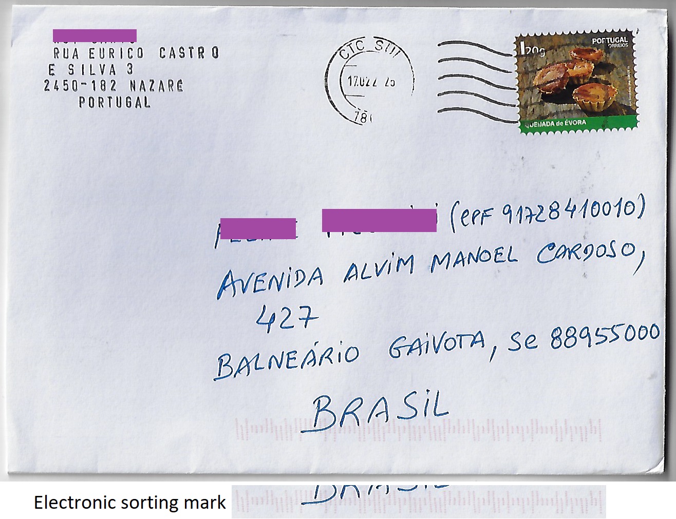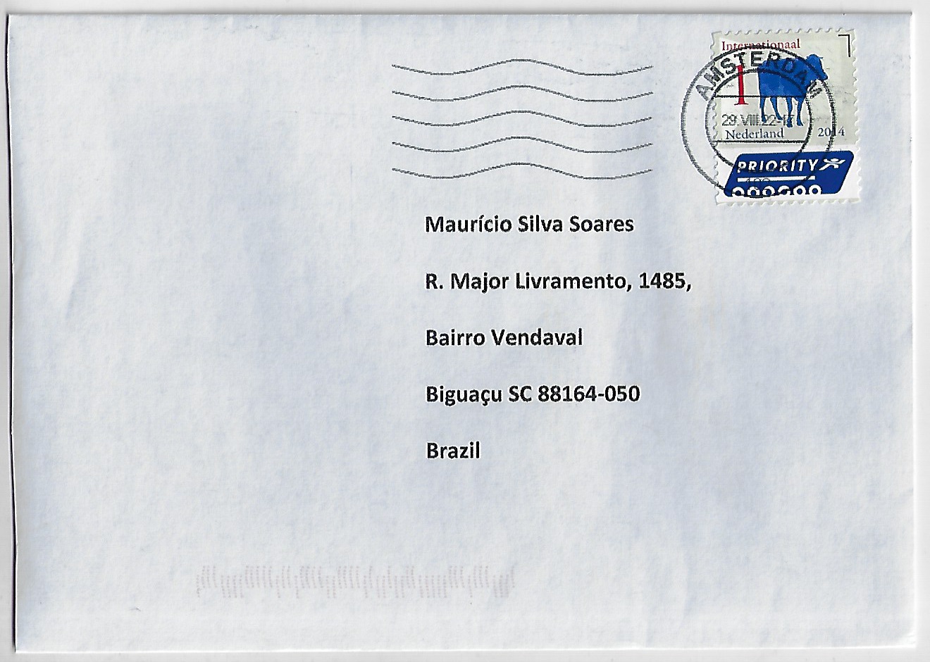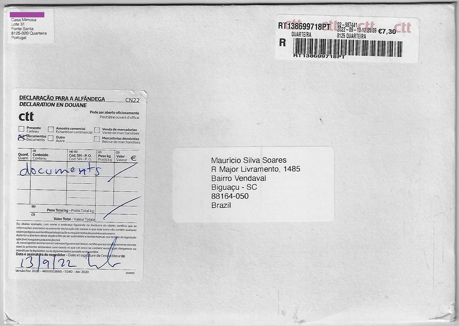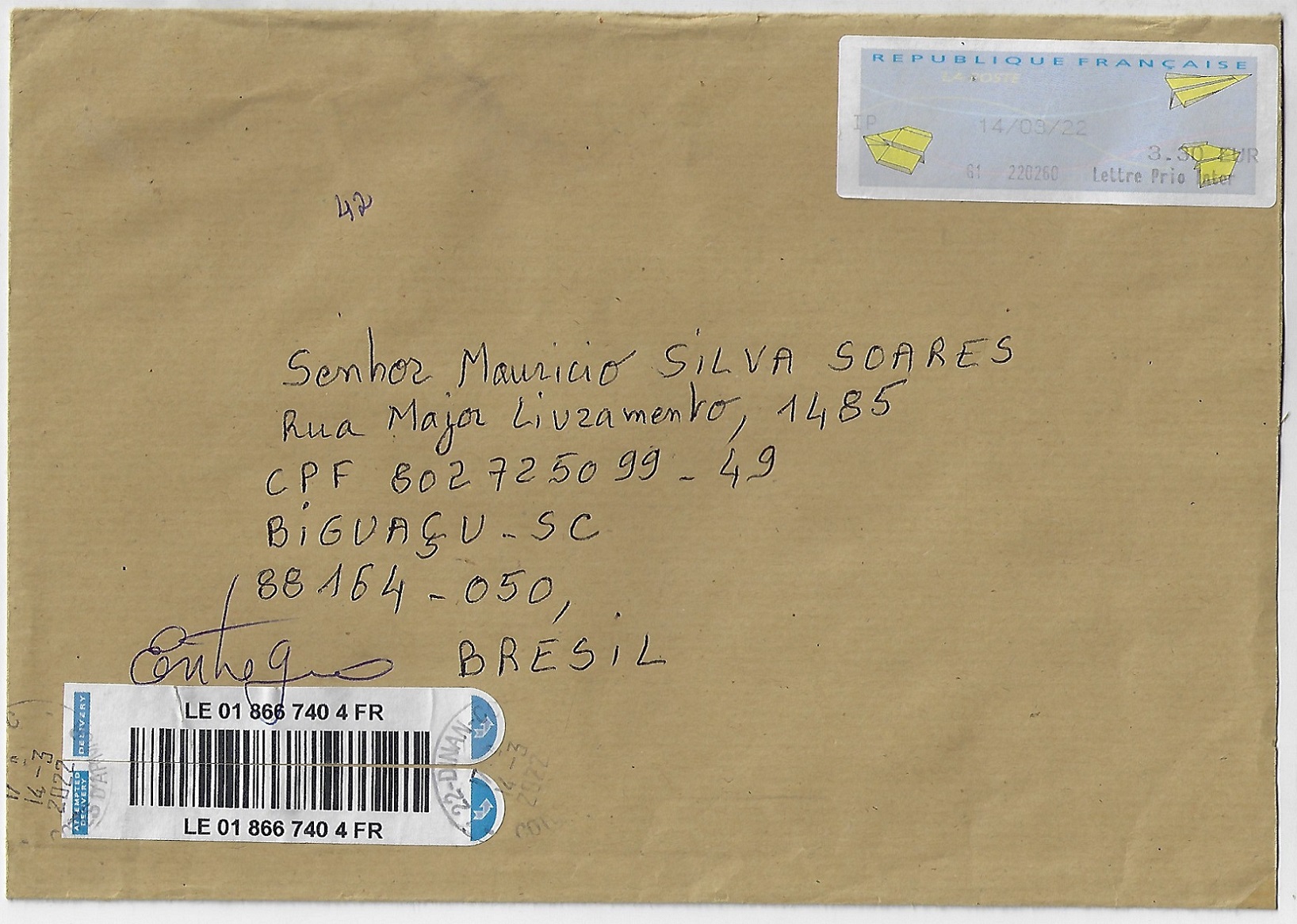 | 84865 | África do Sul, 2022, envelope prioritário registrado enviado de Vredenburg (21/12) para Biguaçu, porteado com franquia mecânica Web RePost (aka "PAT Label") | 10,00 | Foto |