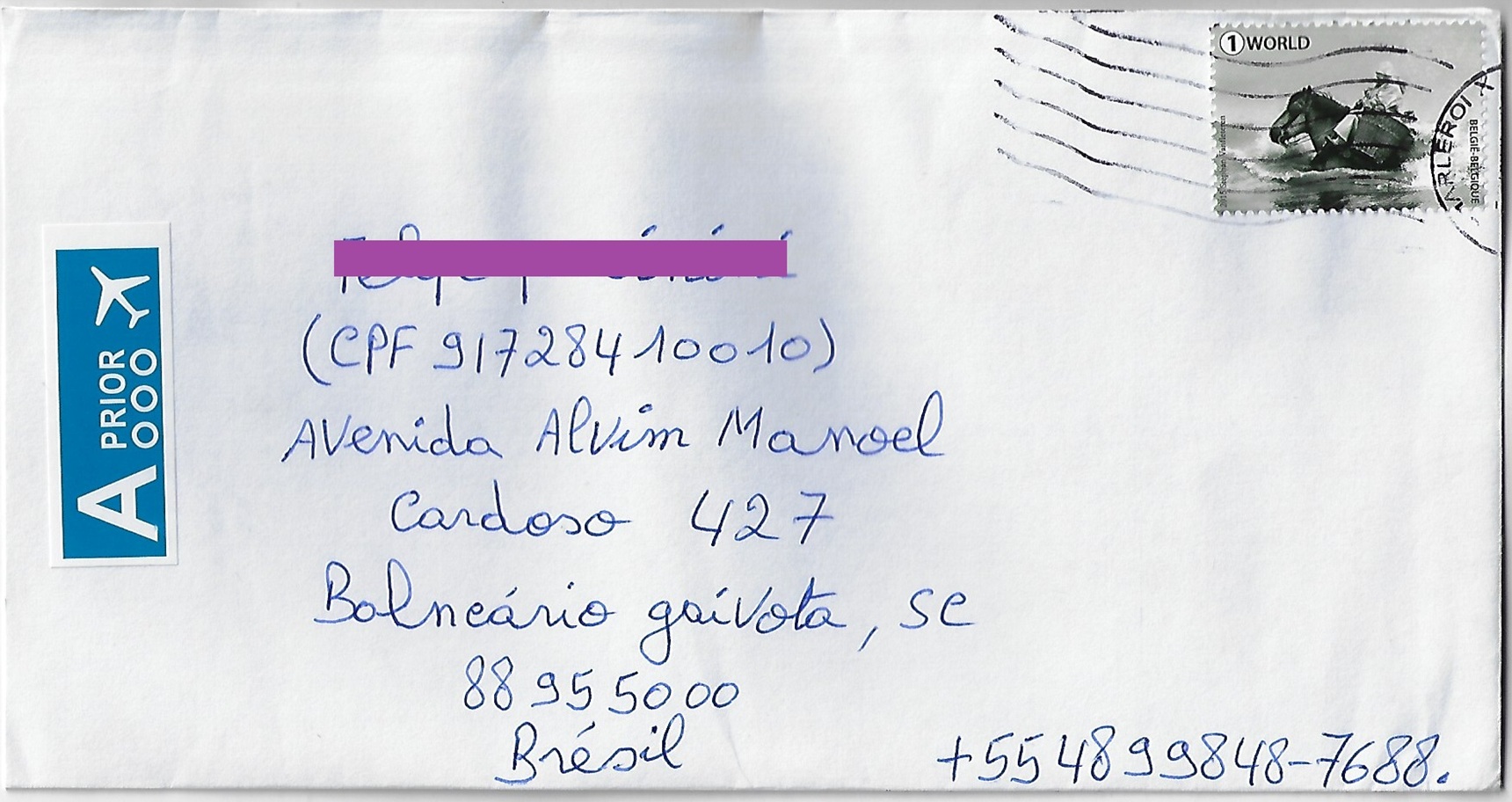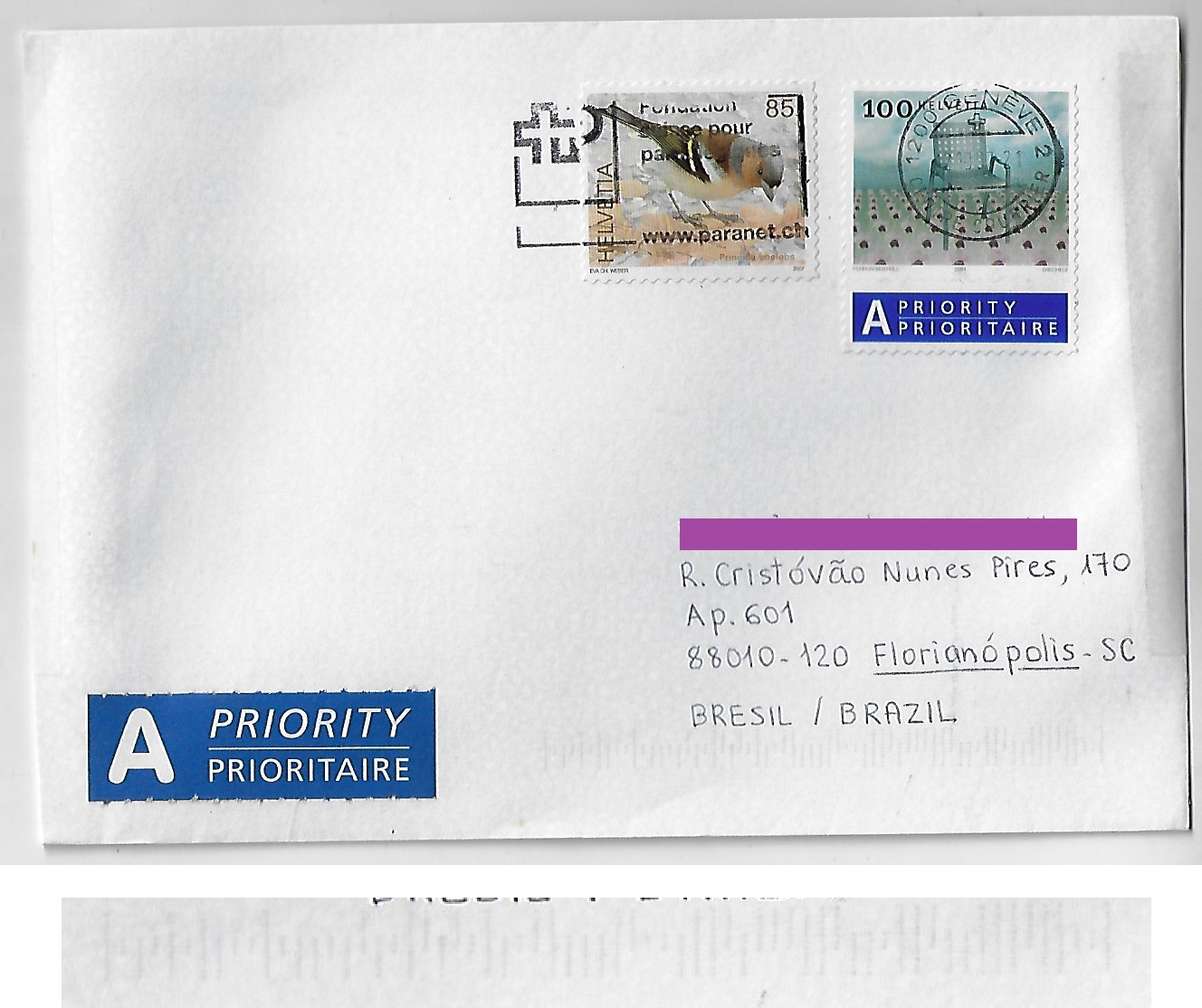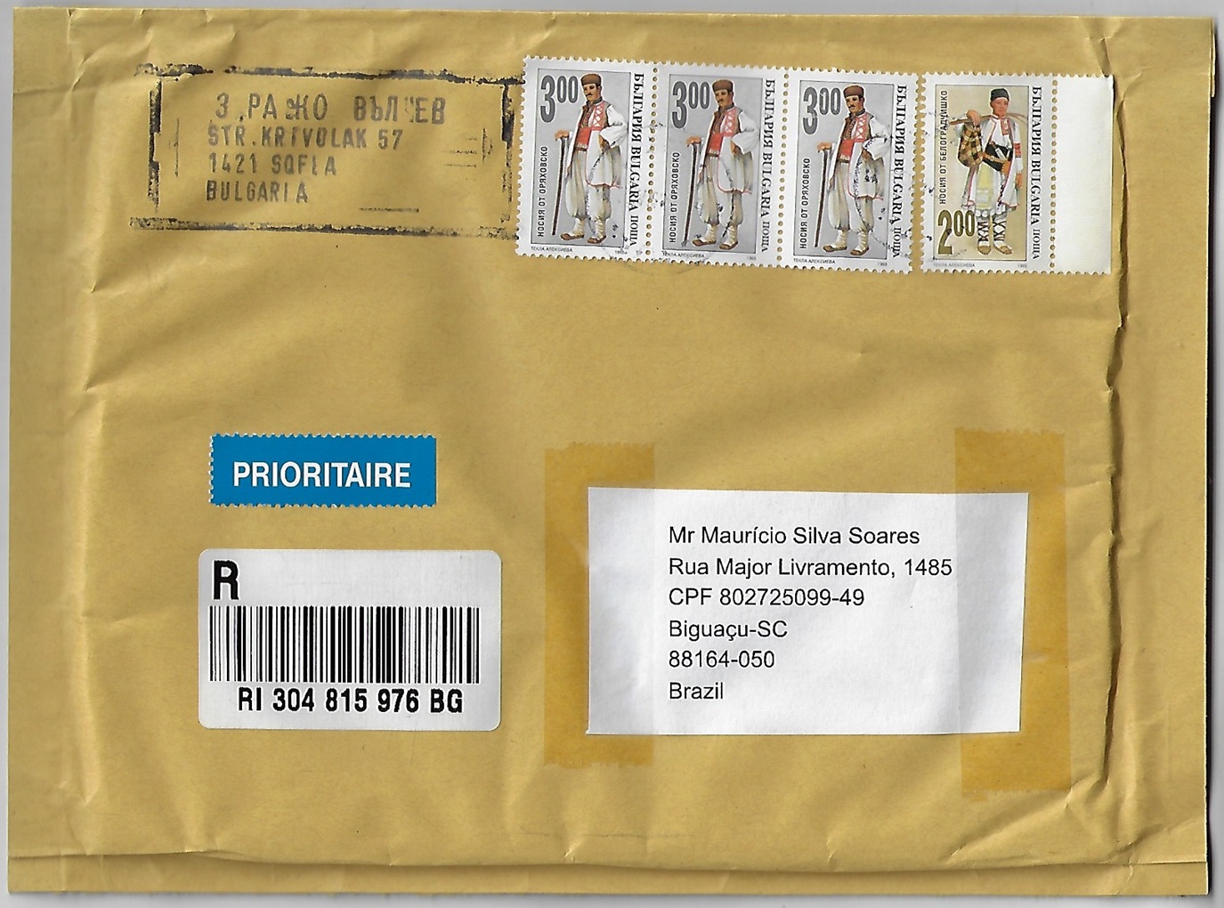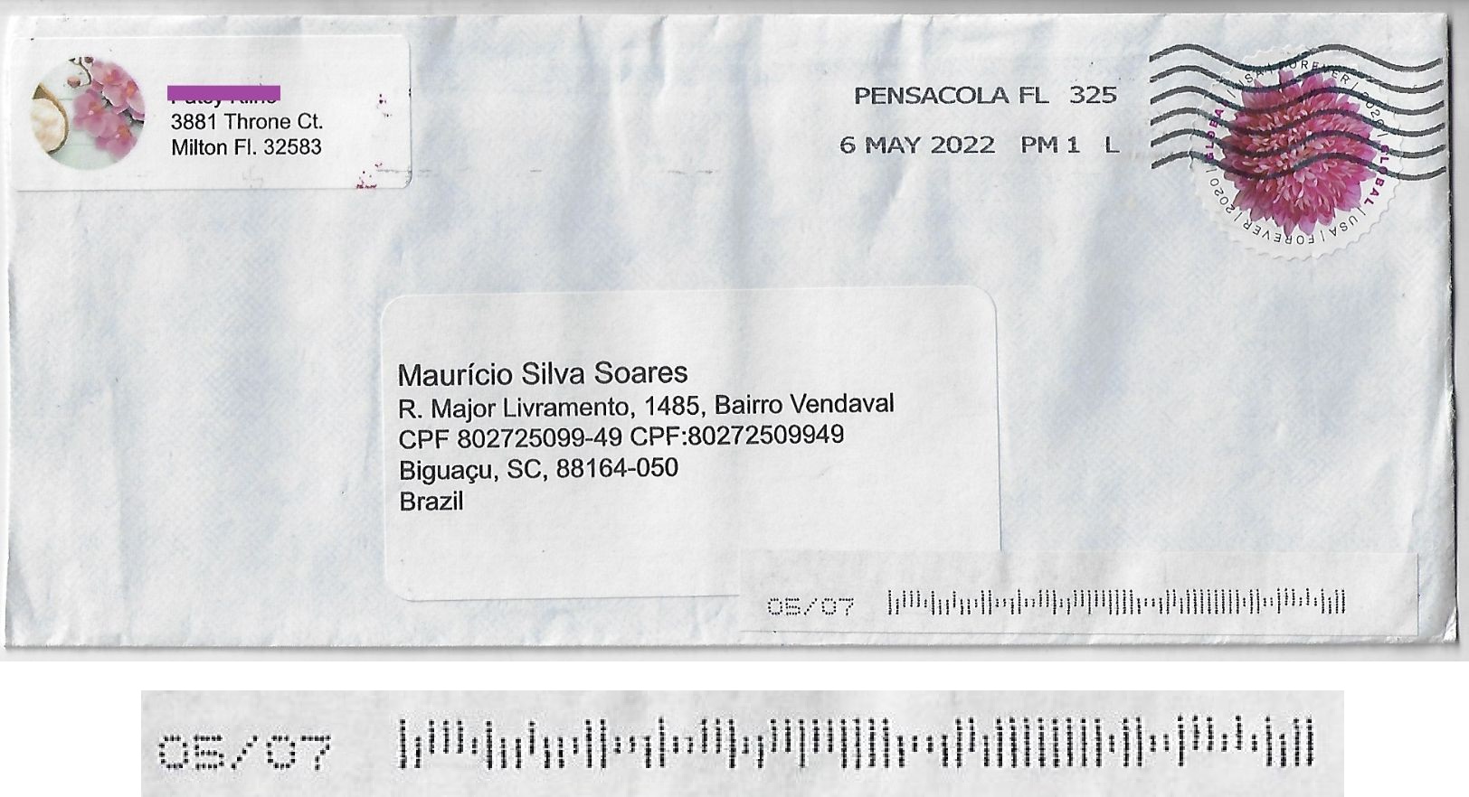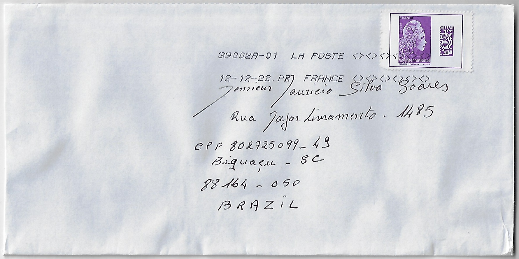 | 84865 | África do Sul, 2022, envelope prioritário registrado enviado de Vredenburg (21/12) para Biguaçu, porteado com franquia mecânica Web RePost (aka "PAT Label") | 10,00 | Foto |